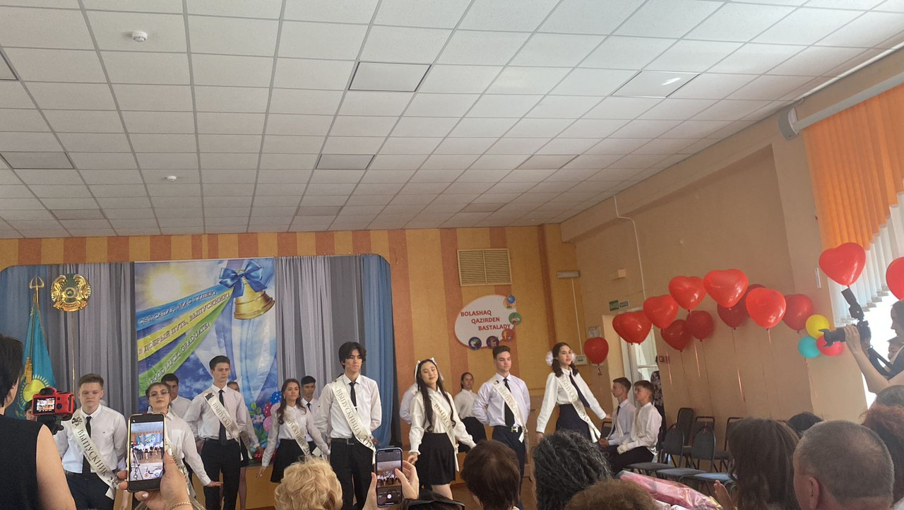 10.00. Звучат позывные праздника. Ведущие праздника учитель Карабекова Р.Т. и ученик 9 «б» класса Бирюков В. начинают праздник стихами о Казахстане (на государственном и русском языках). Ведущие на казахском, русском, английском языках приветствуют гостей, педагогов, родителей. Под музыку и аплодисменты присутствующих, в зал входят выпускники – 2023 года. Ведущие объявляют об открытии праздника, звучит Государственный Гимн Республики Казахстан.