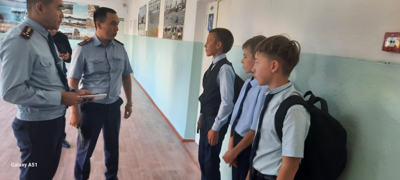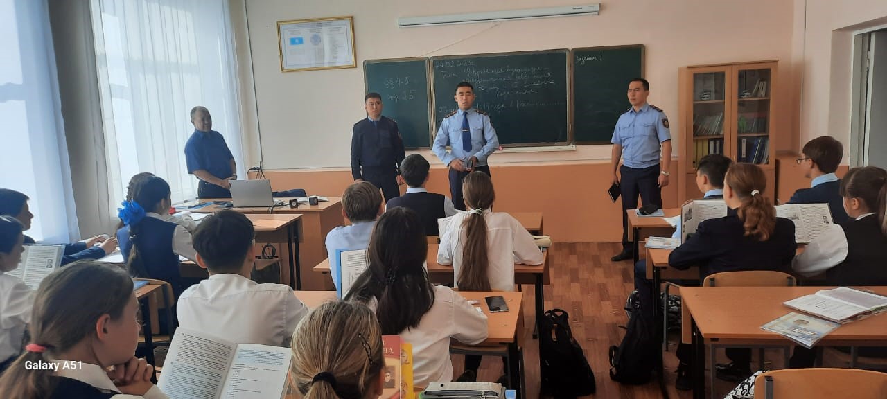 Оқушыларға ҚРКӘҚт442 - бабы (заңды өкілдерсіз түнде тұрғын үйден тыс жерде кәмелетке толмағандардың болуы), ҚРКӘҚт434-бабы-ұсақ бұзақылық (балағат сөздер, дұрыс емес жерде қоқыс тастау), ҚР Заңын бұзғаны үшін жауапкершілікке тарту және жазалау шаралары туралы айтылды.
