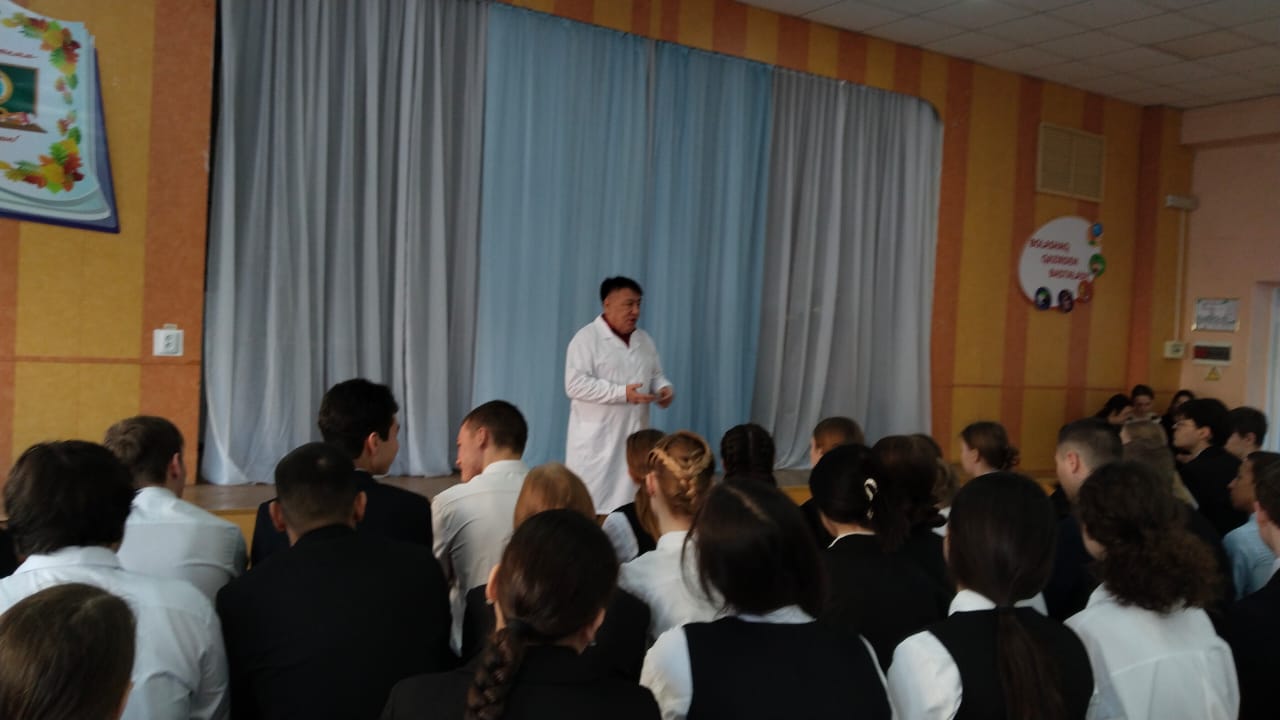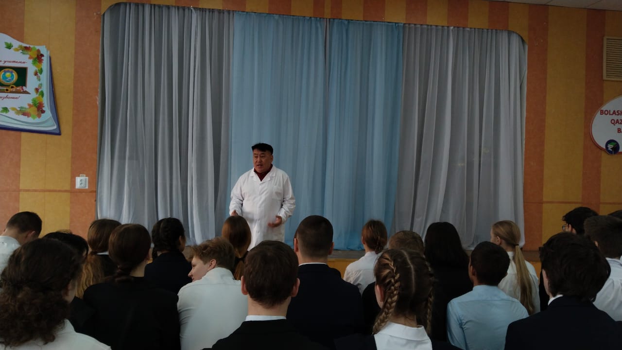 Алибай Калибекович жоғары сынып оқушыларына әлемдегі, еліміздегі эпидемиологиялық жағдай туралы айтып берді. Адамның иммундық жүйесі, АИТВ - инфекциясы, инфекция жолдары және АИТВ – инфекциясының алдын-алу туралы мәселені толығырақ қарастырды. Дәрігер жастарға есірткіні қолданудың зияны, ерте жыныстық қатынас, салауатты өмір салтын ұстану қажеттілігі туралы түсіндірді.