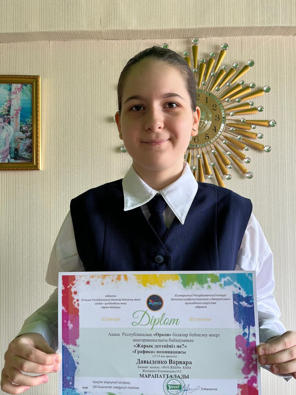 Давыденко Варвара, учащаяся школы №10, приняла участие в XI Открытом республиканском конкурсе детского изобразительного и декоративно-прикладного искусства "Оркен" и стала призёром, завоевав диплом III степени.