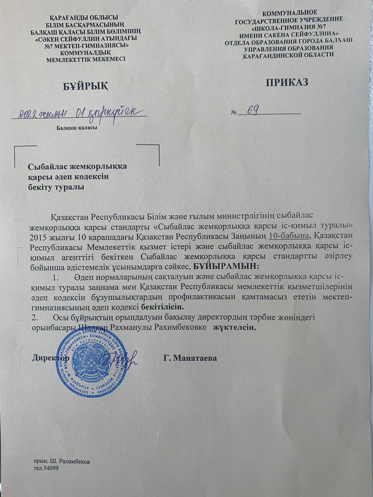 Бұйрық №69