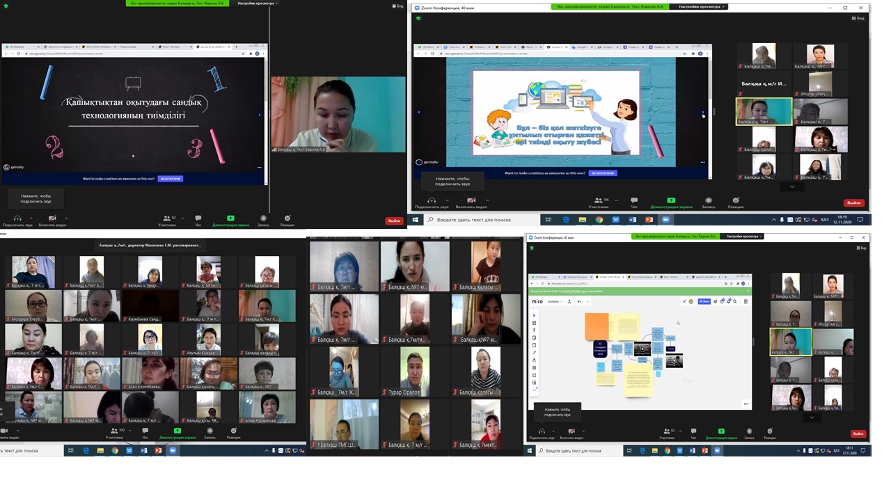 12 қараша күні С.Сейфуллин атындағы №7 мектеп-гимназиясында ZOOM платформасында «Қашықтықтан оқыту – заман талабы» педагогикалық кеңес өтті.12 қараша күні С.Сейфуллин атындағы №7 мектеп-гимназиясында ZOOM платформасында «Қашықтықтан оқыту – заман талабы» педагогикалық кеңес өтті. Күн тәртібінде «Қазақ тілі мен әдебиет пәнін қашықтықтан оқытудағы платформалардың тиімділігі» тақырыбында қазақ тілі мен әдебиет пәні мұғалімі Тлеубекова М.М., «Физика пәнін қашықтықтан оқытудағы әдіс – тәсілдер» тақырбында физика пәні мұғалімі Аманкелдыева А.С. «Тарих пәнінде қашықтықтан оқытуда сандық технологияларды қолдану» тақырыбында тарих пәні |