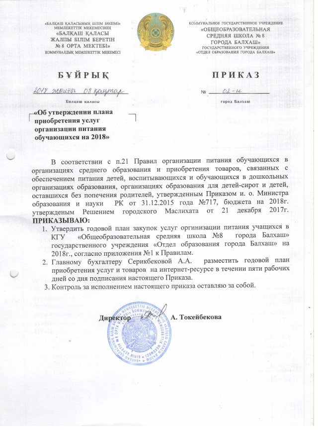 2018 жылы оқушыларға тамақтандыру қызметтерін көрсету жоспарын бекіту туралы бұйрық2018 жылы оқушыларға тамақтандыру қызметтерін көрсету жоспарын бекіту туралы бұйрық |
