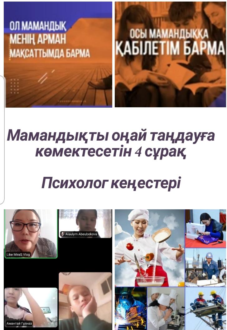Еңбек күніне орай Zoom платформасы арқылы 9 сынып оқушыларына арналған "Мамандықты оңай таңдауға көмектесетін 4 сұрақ" тақырыбында психолог кеңестері айтылды. Мақсат: Оқушыларға мамандық таңдауда олардың негізгі түрлері, классификациясы белгілері, мамандық тобы, таңдау әдістері туралы білімдерін, түсініктерін кеңейте отырып, мамандықтарға деген ынта – ықыласын, қызығушылықтарын арттыру.