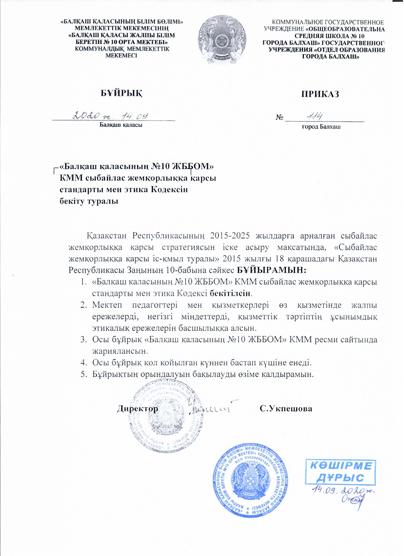 "Балхаш қаласының №10 ЖББОМ" КММ сыбайлас жеқорлыққа қарсы стандарты мен этика кодексін бекіту туралы"Балхаш қаласының №10 ЖББОМ" КММ сыбайлас жеқорлыққа қарсы стандарты мен этика кодексін бекіту туралы |