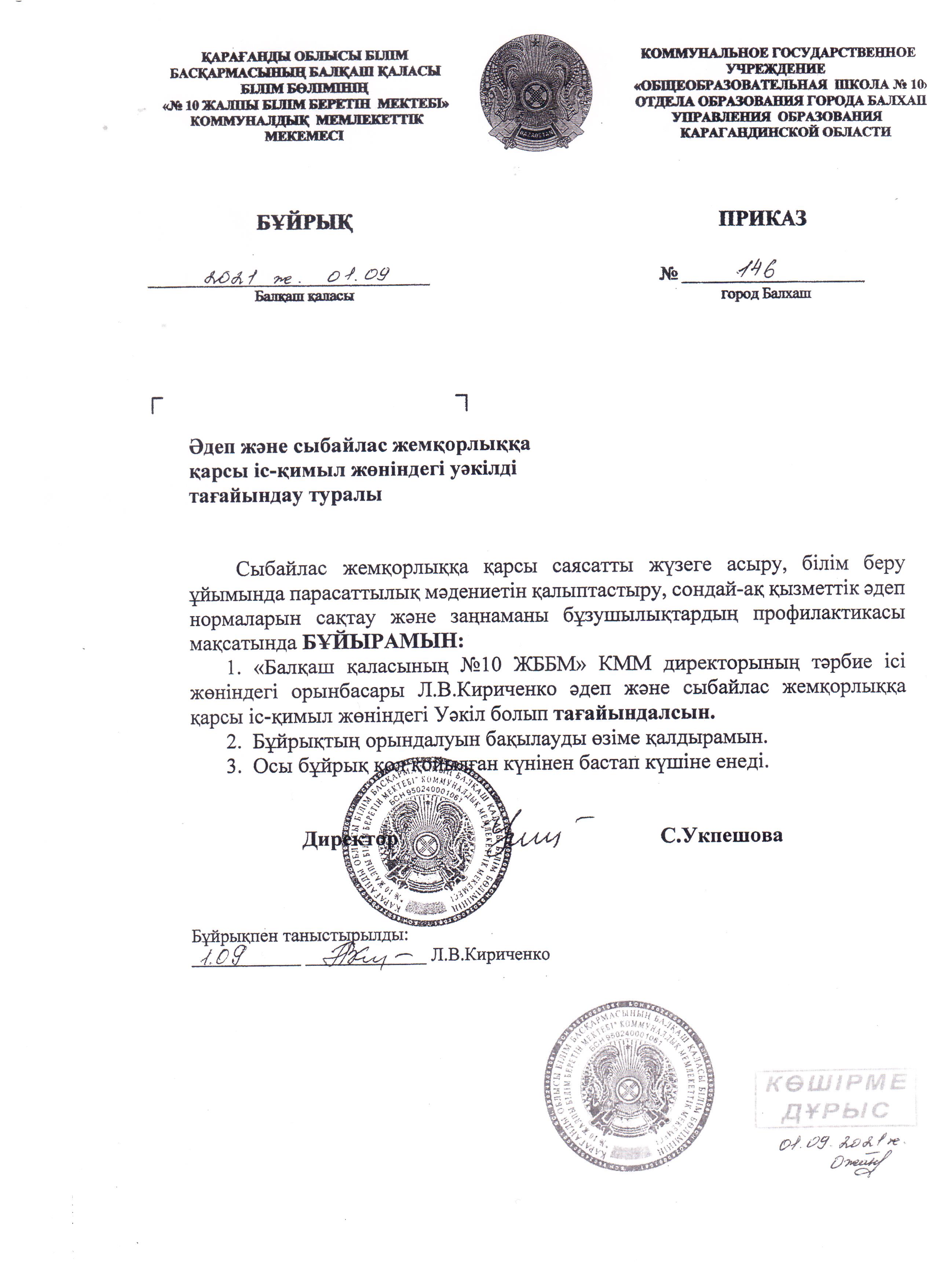 План работы по профилактике и противодействию коррупции КГУ "ОШ №10" г. Балхаш 2021-2022 учебный год