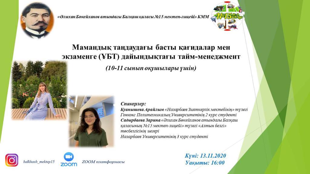 Проект "Билет в будущее"13.11.2020 күні Облыстық "Болашаққа жолдама" жобасы негізінде "Мамандық таңдаудағы басты қағидалар мен экзаменге (ҰБТ) дайындықтағы тайм-менеджмент" тақырыбында онлайн еркін форматта кездесу өтті. Спикерлер: 1. Мектеп-лицейіміздің түлегі «Алтын белгі» төсбелгісінің иегері, Халықаралық “Шексіз математика” жобасы аясында өткен (Болгария-Қазақстан ) олимпиадасының жүлдегері, Назарбаев Университетінің 3 курс студенті-Садырбаева Зарина; 2. «Назарбаев Зияткерлік мектебінің» түлегі,Гонконг Политехникалық Университетінің 2 курс студенті-Куанышева Арайлым. |