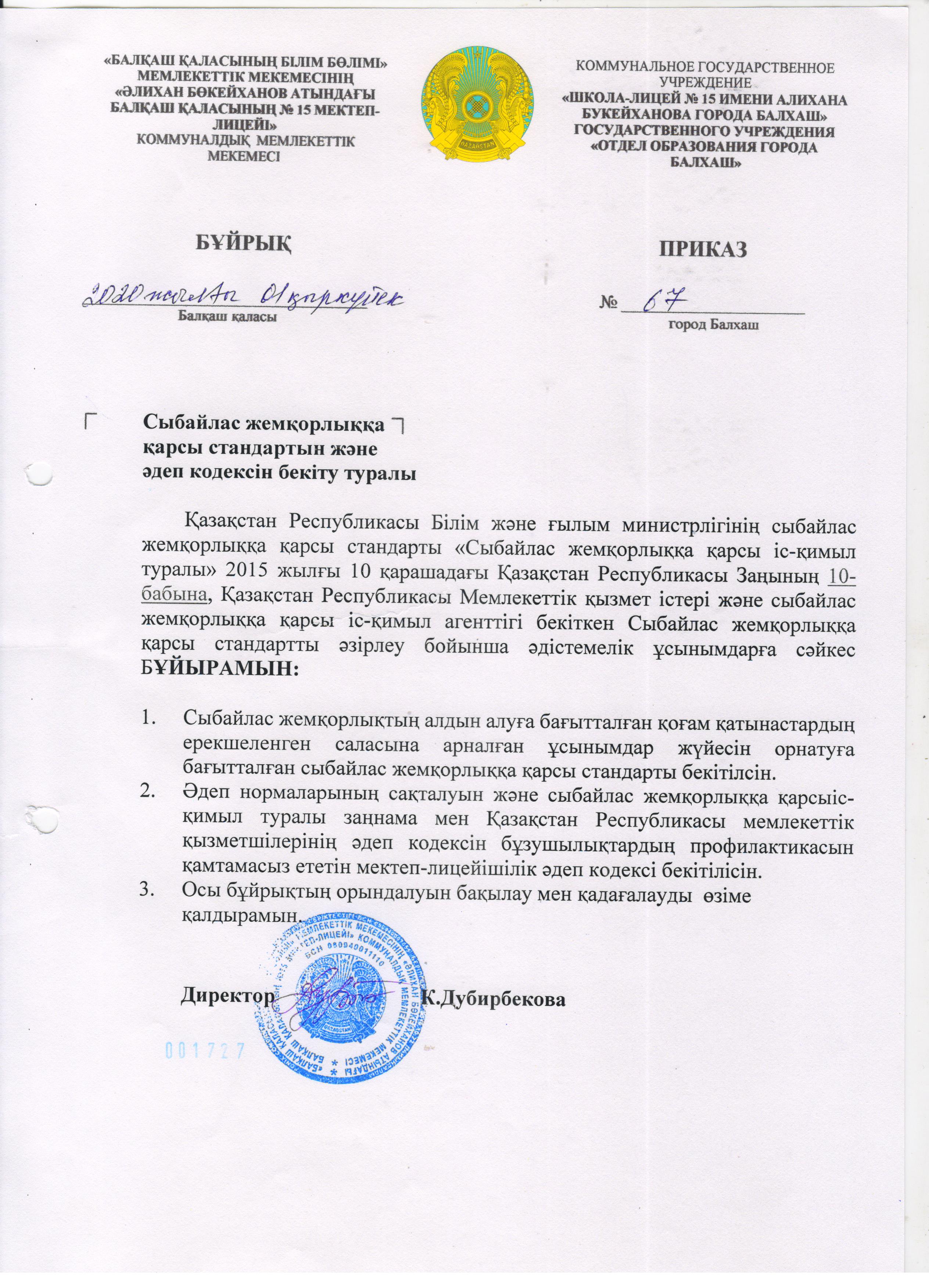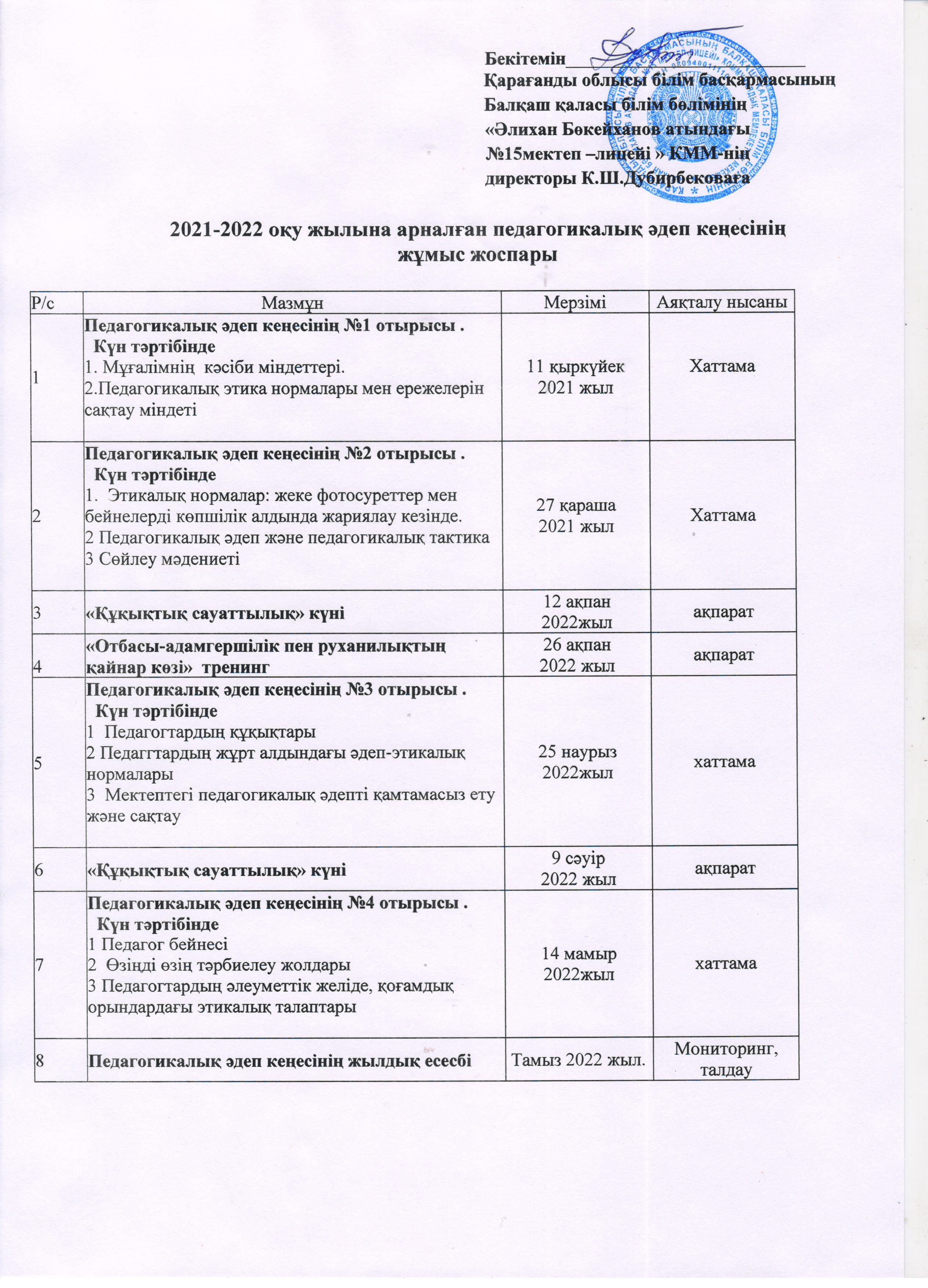 Қазақстан Республикасының 2015-2025 жылдарға арналған сыбайлас жемқорлыққа қарсы стратегиясын іске асыру және көлеңкелі экономикаға қарсы іс-қимылды іске асыру бойынша Қарағанды облысы білім басқармасының Балқаш қаласы білім бқлімінің «Әлихан Бөкейханов атындағы №15 мектеп-лицейі» КММ-нің 2021-2023 жылдарға арналған іс-шаралар жоспары