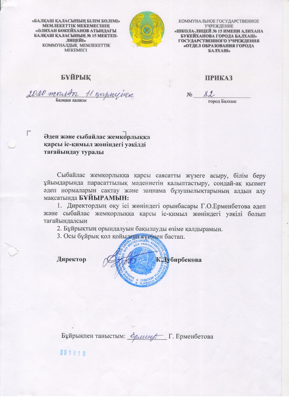 Әдеп және сыбйлас жемқорлыққа қарсы іс - қимыл жөніндегі уәкілді тағайындау туралыӘдеп және сыбйлас жемқорлыққа қарсы іс - қимыл жөніндегі уәкілді тағайындау туралы |