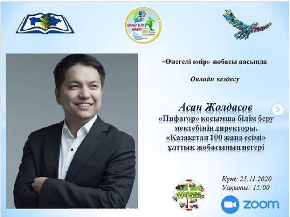 “Қазақстан 100 жаңа есімі” ұлттық жобасының иегері Асан Жолдасовпен Zoom платформасында онлайн кездесу✅25.11.2020 күні облыстық “Өнегелі өмір“ жобасы аясында, “Пифагор” қосымша білім беру мектебінің директоры, “Қазақстан 100 жаңа есімі” ұлттық жобасының иегері Асан Жолдасовпен Zoom платформасында өте әсерлі, тартымды онлайн кездесу өтті! Оқушылар қызығушылық танытып, кері байланыс орнатты. |