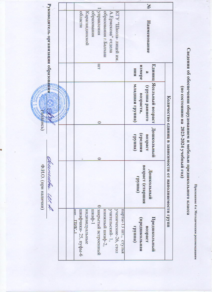 Сведения об обеспечении оборудованием и мебелью предшкольного класса (по состоянию на 2023-2024 уч.год)парты, стулья, шкафы, стол |