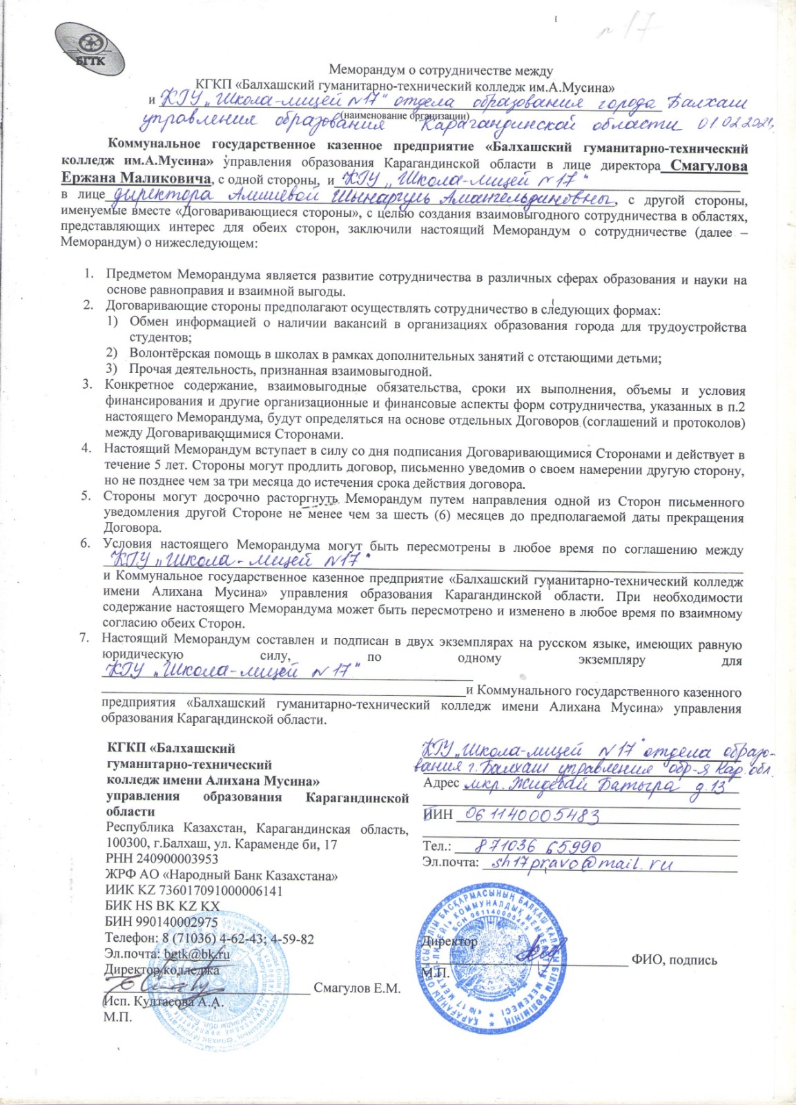 Меморандум о сотрудничестве между КГКП "Балхашский гуманитарно-технический колледж им.А.Мусина"Меморандум о сотрудничестве между КГКП "Балхашский гуманитарно-технический колледж им.А.Мусина" |