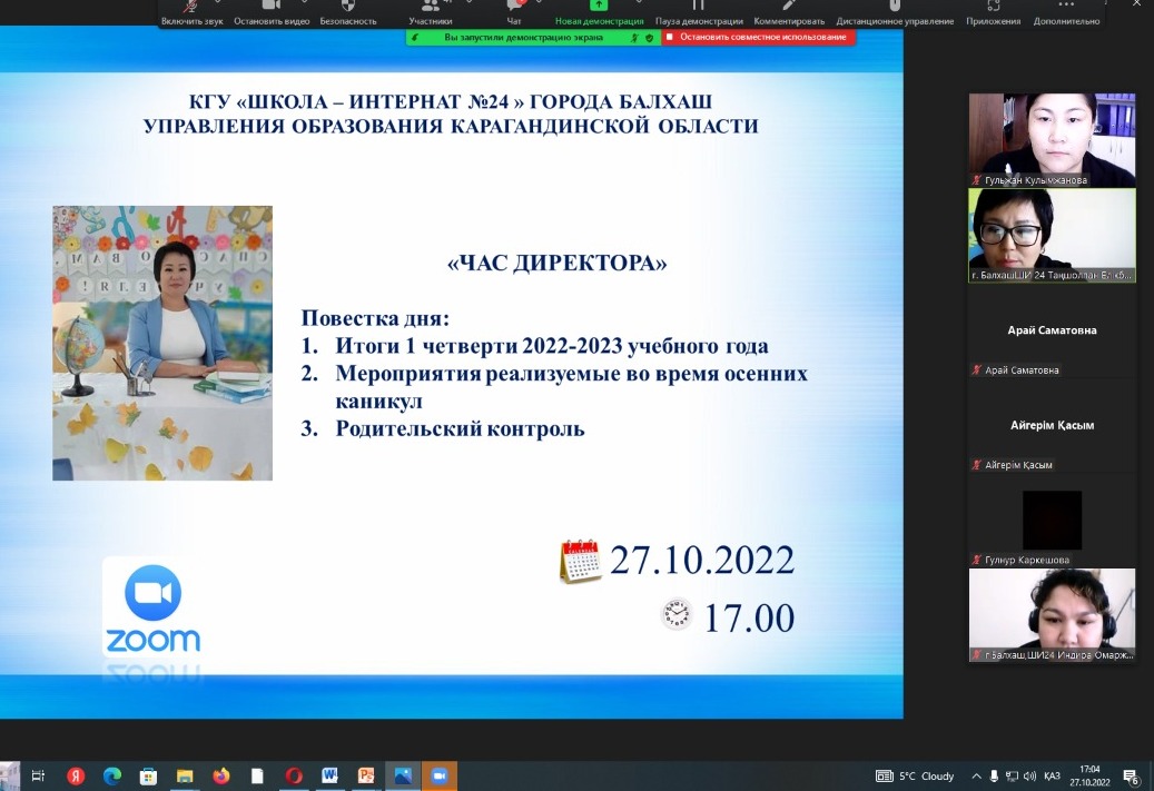 жалпымектепішілік ата-аналар жиналысы2022 жылы 27 қазанда Қарағанды облысы білім басқармасының Балқаш қаласы білім бөлімінің "№24 мектеп-интернаты"КММ-сінде жалпымектепішілік ата-аналар жиналысы ZOOM платформасында онлайн режимде өтті. Күн тәрбінде: 1. І тоқсан қорытындысы 2. Күзгі канукул кезіндегі қауіпсіздік ережелері және өткізілетін іс-шаралар 3. Ата-аналар бақылауы . Қауіпсіз мектеп. 4. Әр түрлі мәселелер. Ата -аналар жиналысында оқу ісінің орынбасары И.О.Маулетова 1 тоқсан қорытындысымен таныстырып, жеткен жетістіктерді атап айтты. Күн тәртібіндегі екінші мәселе бойынша тәрбие ісінің орынбасары Г.М.Кулымжанова төтенше жағдайдағы алгоритм алғышарттары мен таныстырып, ата-аналар тарапынан бақылау түрлеріне тоқталды. |