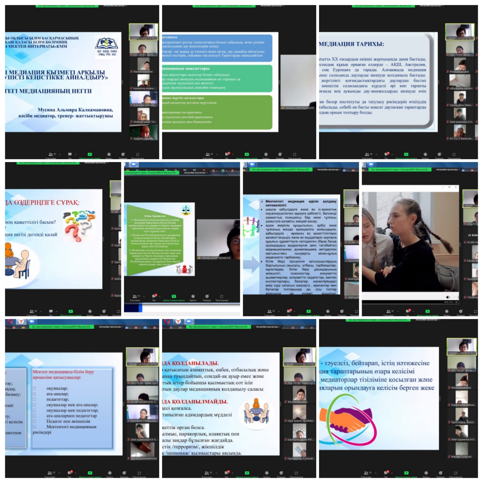 "Мектептегі медиация қызметі арқылы мектепті қауіпсіз кеңістікке айналдыру"Қарағанды облысы білім басқармасының Балқаш қаласы білім бөлімінің "№24 мектеп-интернаты" КММ-сінің директоры, кәсіби медиатор, тренер -жаттықтырушы А.К.Мусина 01.11.2022 жылы Қарағанды облысы білім беру ұйымдарының сынып жетекшілеріне арналған күзгі мектеп аясында "Кәсіби өсу мектебі" атты оқыту курсында "Мектептегі медиация қызметі арқылы мектепті қауіпсіз кеңістікке айналдыру" тақырыбында өз іс-тәжірибесімен бөлісті. Жалпы медиация қызметінің негізімен таныстыра отырып, медиация қағидаттары және практика жүзінде қолданысы бойынша бейне роликтер көрсету арқылы құнды мағлұматтар берді. |