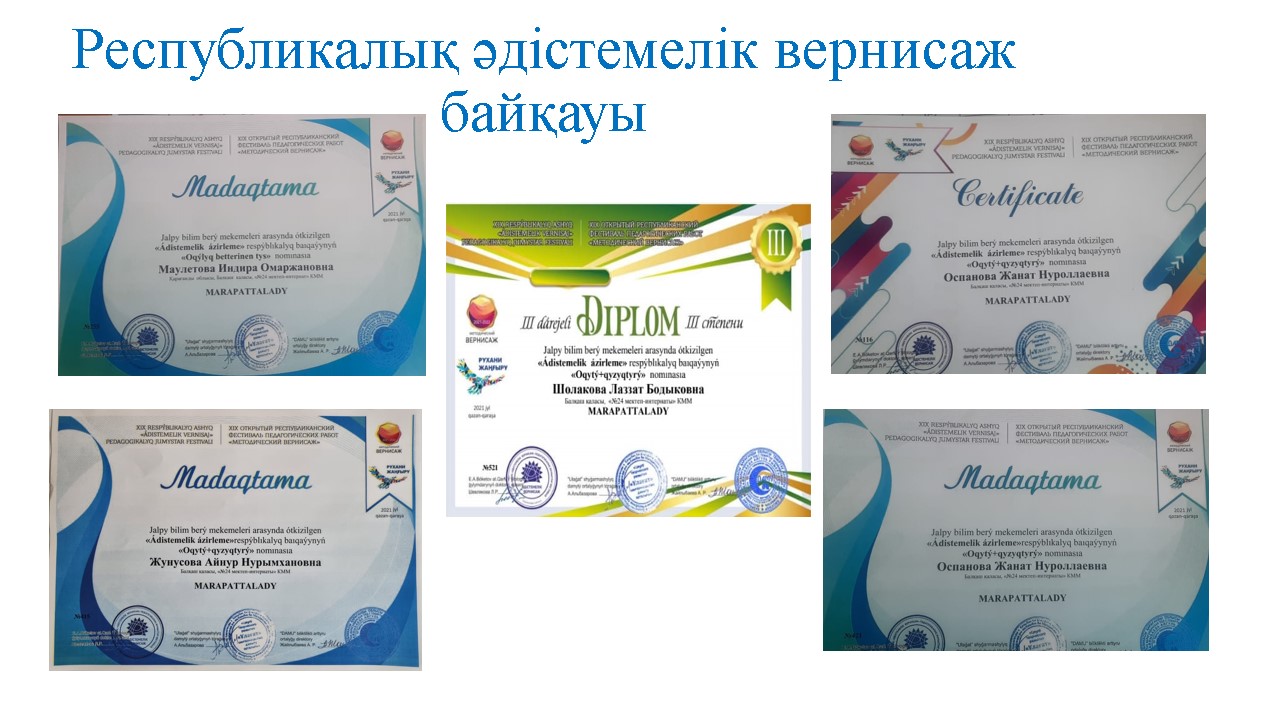 В республиканском конкурсе «МЕТОДИЧЕСКАЯ РАЗРАБОТКА» среди общеобразовательных школ с дипломом III степени Шолакова Л.Б. в номинации «ИНТЕРЕСНОЕ ОБУЧЕНИЕ» Жунусова А.Н., Оспанова Ж.Н. Маулетова И.О. сертификат, диплом выдан.
