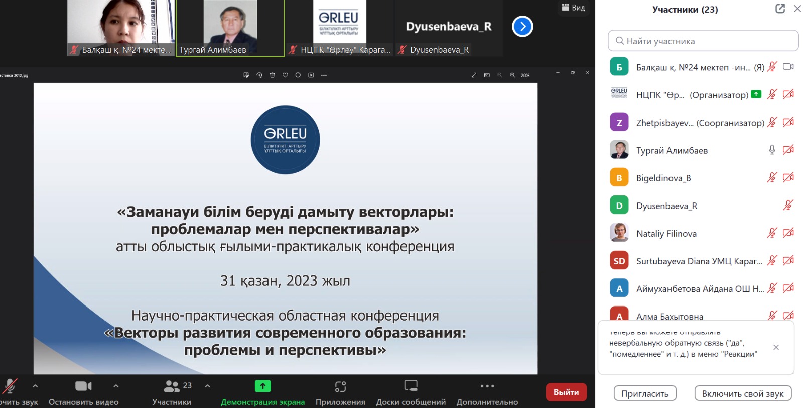 «Өрлеу» БАҰО» АҚ «Қарағанды КДИ» "Заманауи білім беруді дамыту векторлары: проблемалар мен перспективалар" атты облыстық ғылыми - практикалық онлайн конференциясы 31 қазанда өтті.«Өрлеу» БАҰО» АҚ «Қарағанды КДИ» "Заманауи білім беруді дамыту векторлары: проблемалар мен перспективалар" атты облыстық ғылыми - практикалық онлайн конференциясы 31 қазанда өтті. Конференцияға Қарағанды облысы бойынша білім беру ұйымдарының барлық педагогтері шақырылады. Конференция жұмысының бағыттары: ✔️ ШЖМ: даму перспективалары ✔️ Ұлттық құндылықтар негізінде тәрбиелеу ✔️ Функционалдық сауаттылықты дамыту ✔️ Баланың тұлға ретінде дамуына заманауи көзқарас. Біздің мектептің химия пәні мұғалімі Ұлдахан П.Р. өзінің іс тәжірибесімен облыс деңгейінде бөлісті. Баяндама тақырыбы: "ШЖМ-де жаңа технологияларды тиімді қолдану арқылы білім сапасын арттыру". Баяндама көлемі жағынан ауқымды, мазмұны терең жүйелі түрде жазылған. Қазіргі таңдағы білім беру үдерісіндегі жәнеде негізгі мәселенің бірі - ол оқушылардың білім сапасын көтеру. Осы орайда әріптесіміз ШЖМ негізгі білім беру үдерісіндегі қиындықтардан шығу мақсатында мұғалімге көмекші құрал ретінде жәнеде барлық оқушыға көңіл аудару барысында өзінің сабақтарында қолданып жүрген біршама цифрлық платформалардың тиімділігі жайлы толық ашып айтты. . Конференция жоғары дәрежеде өтті. |