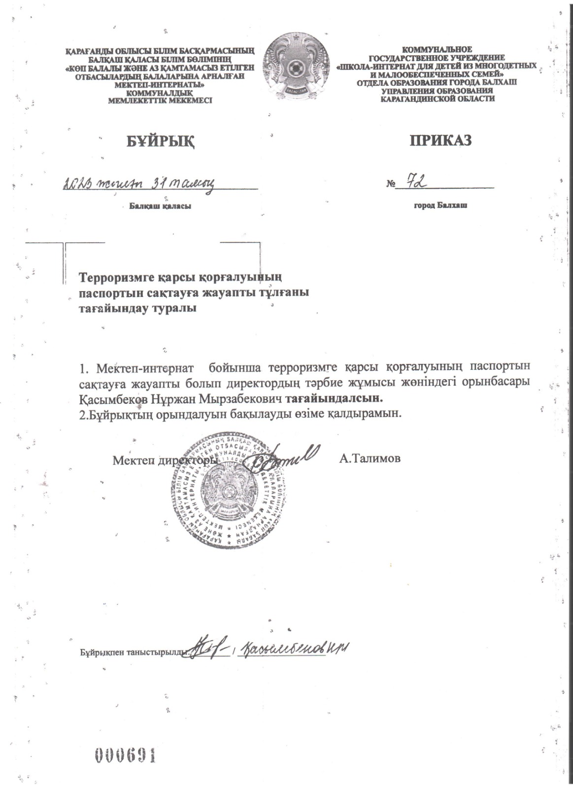 Терроризмге қарсы қорғалуының паспортын сақтауға жауапты тұлғаны тағайындау туралы