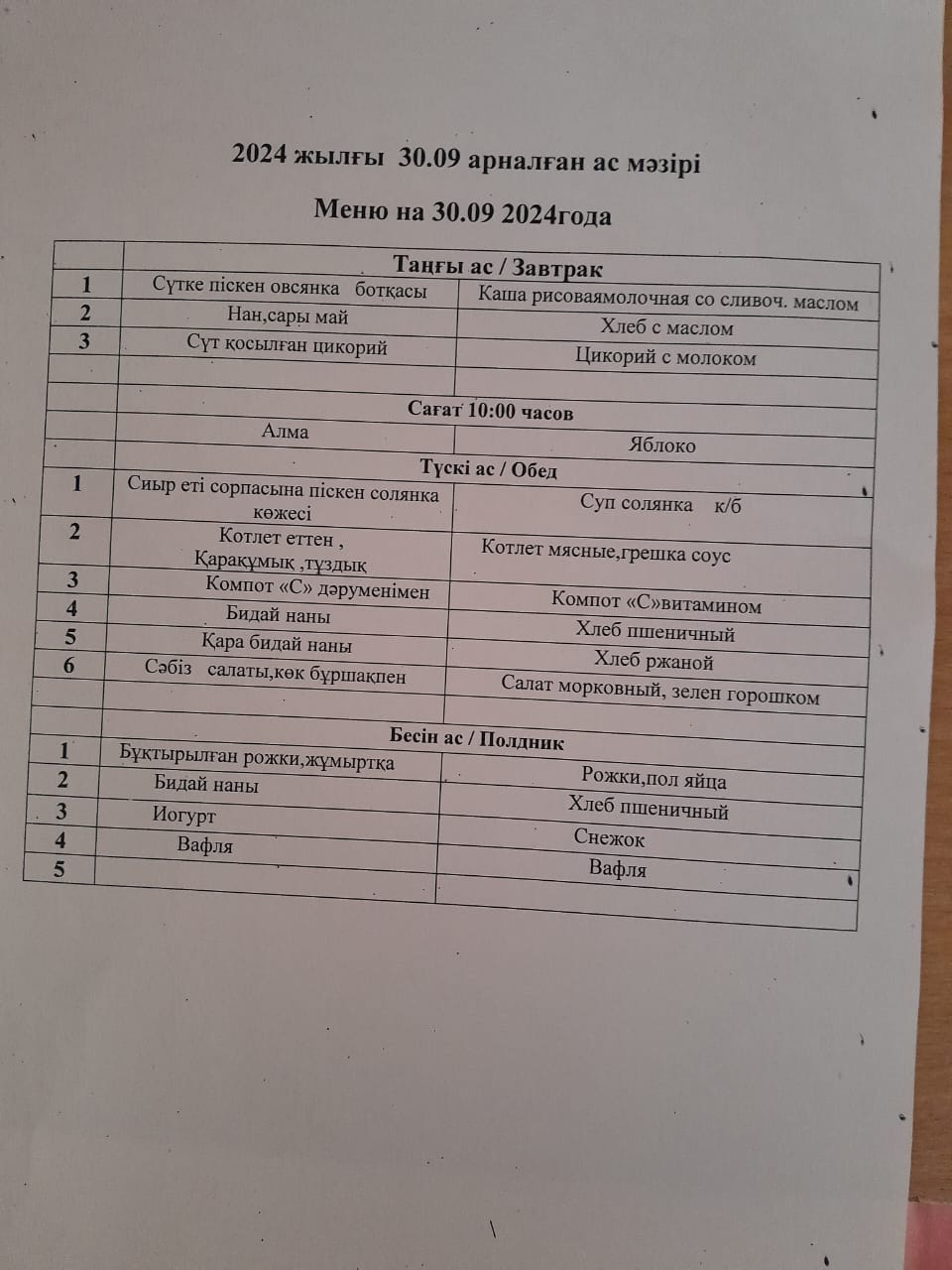 Меню 30.09.2024Астарыңыз дәмді болсын! |