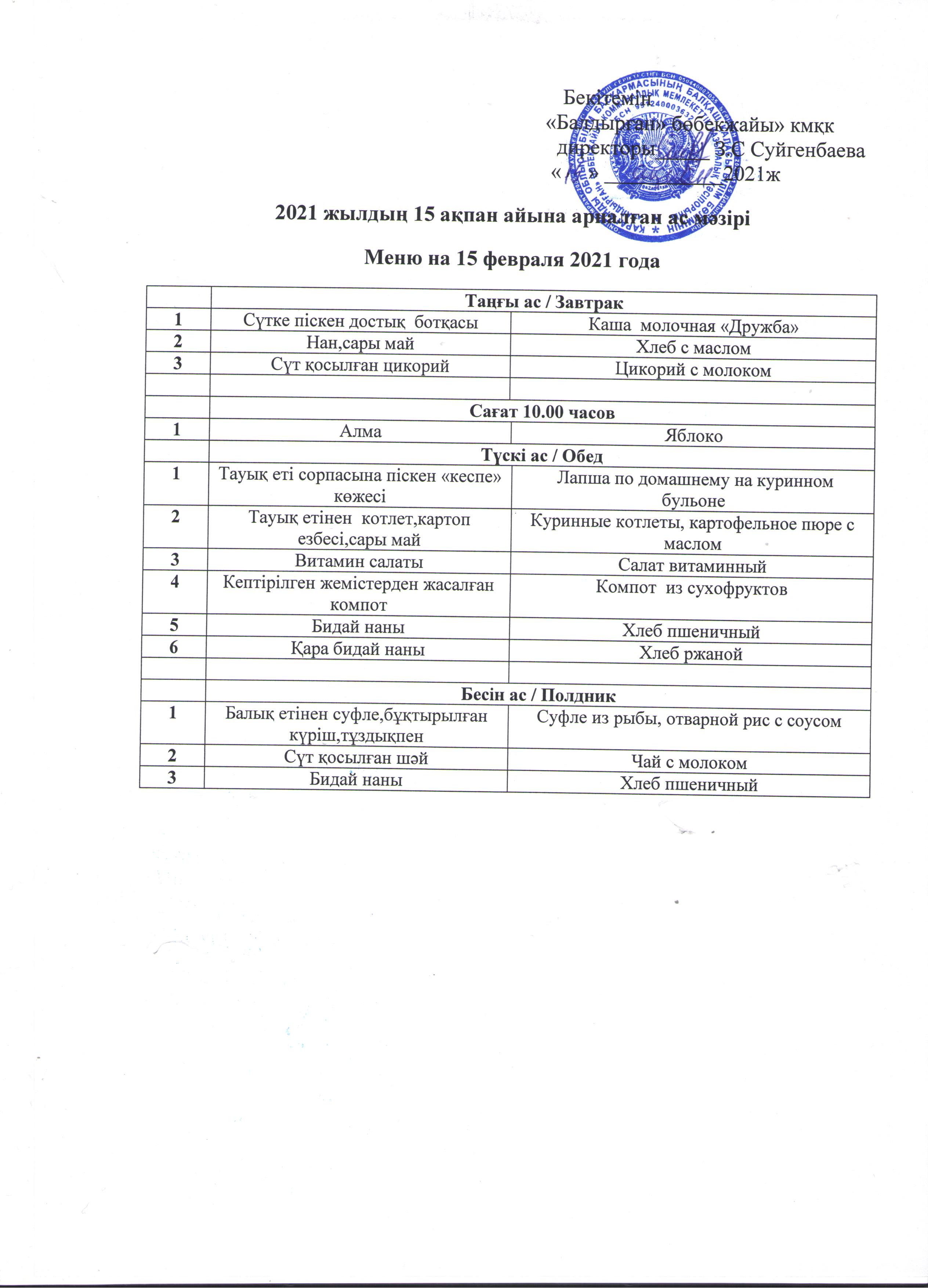 15.02.2021 ж.2021 жылдың 15 ақпан айына арналған ас мәзірі |