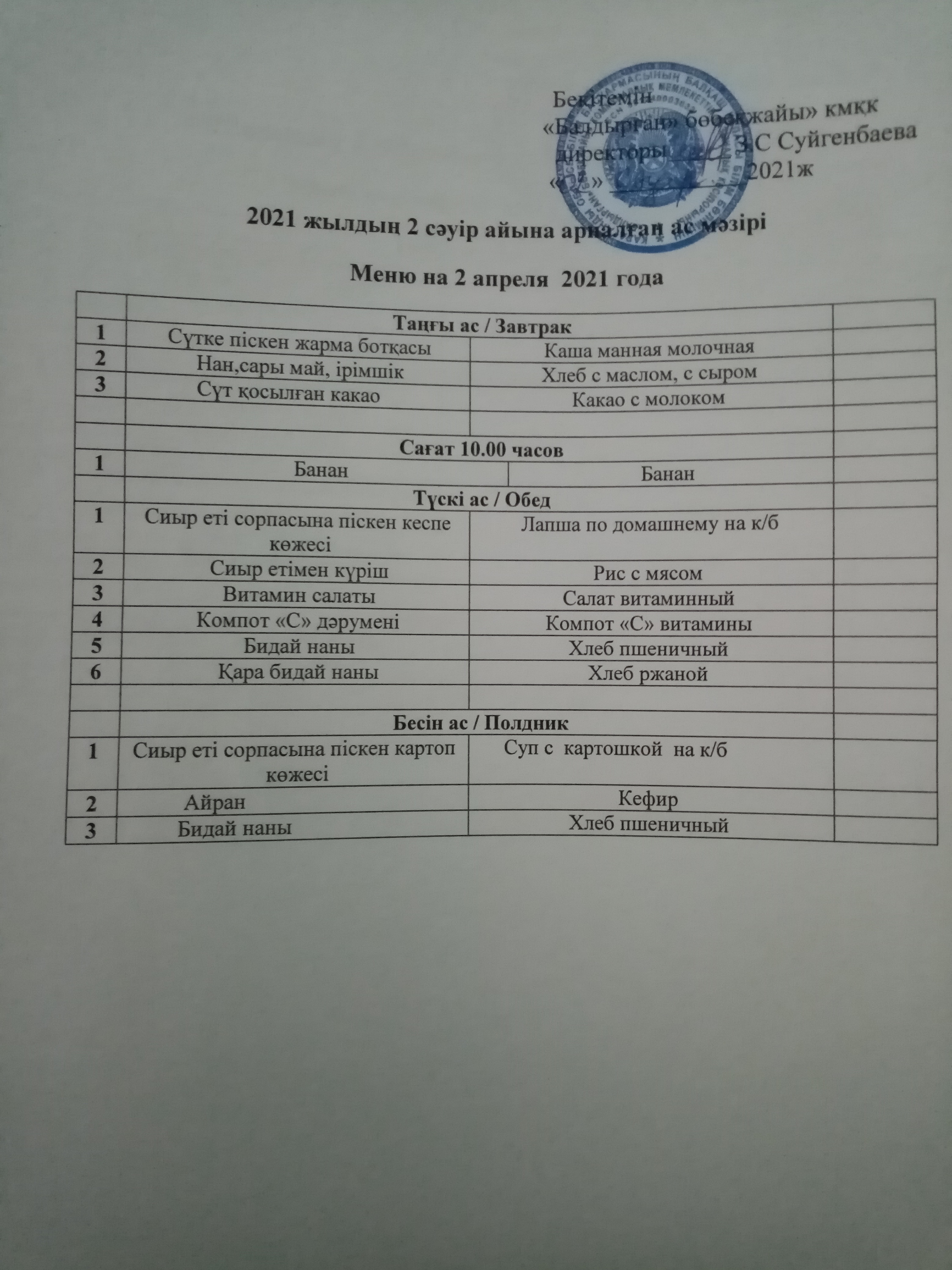 02.04.2021ж2021 жылдың 2 сәуiр айына арналған ас мәзірі |
