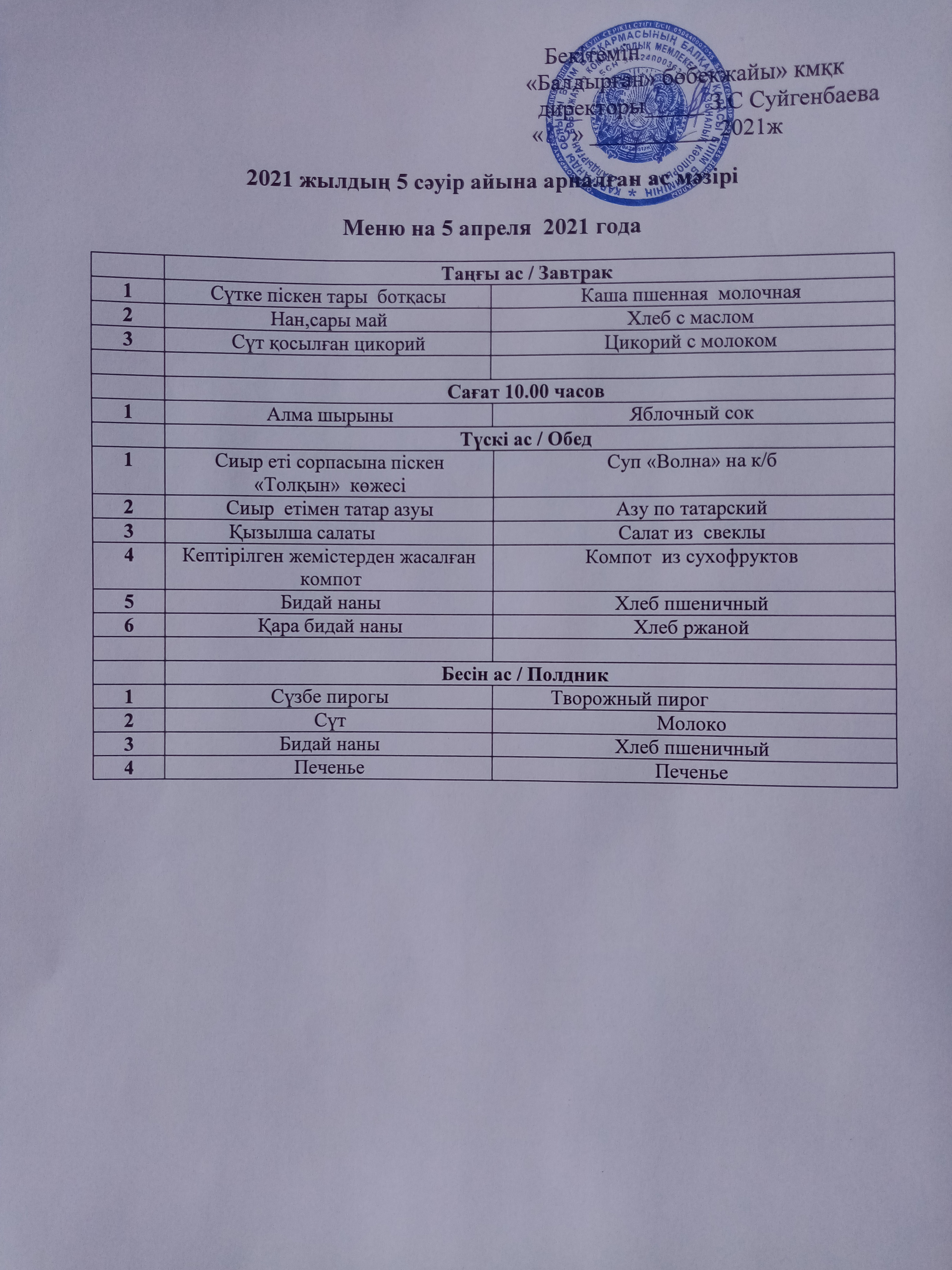 05.04.2021ж2021 жылдың 5 сәуiр айына арналған ас мәзірі |