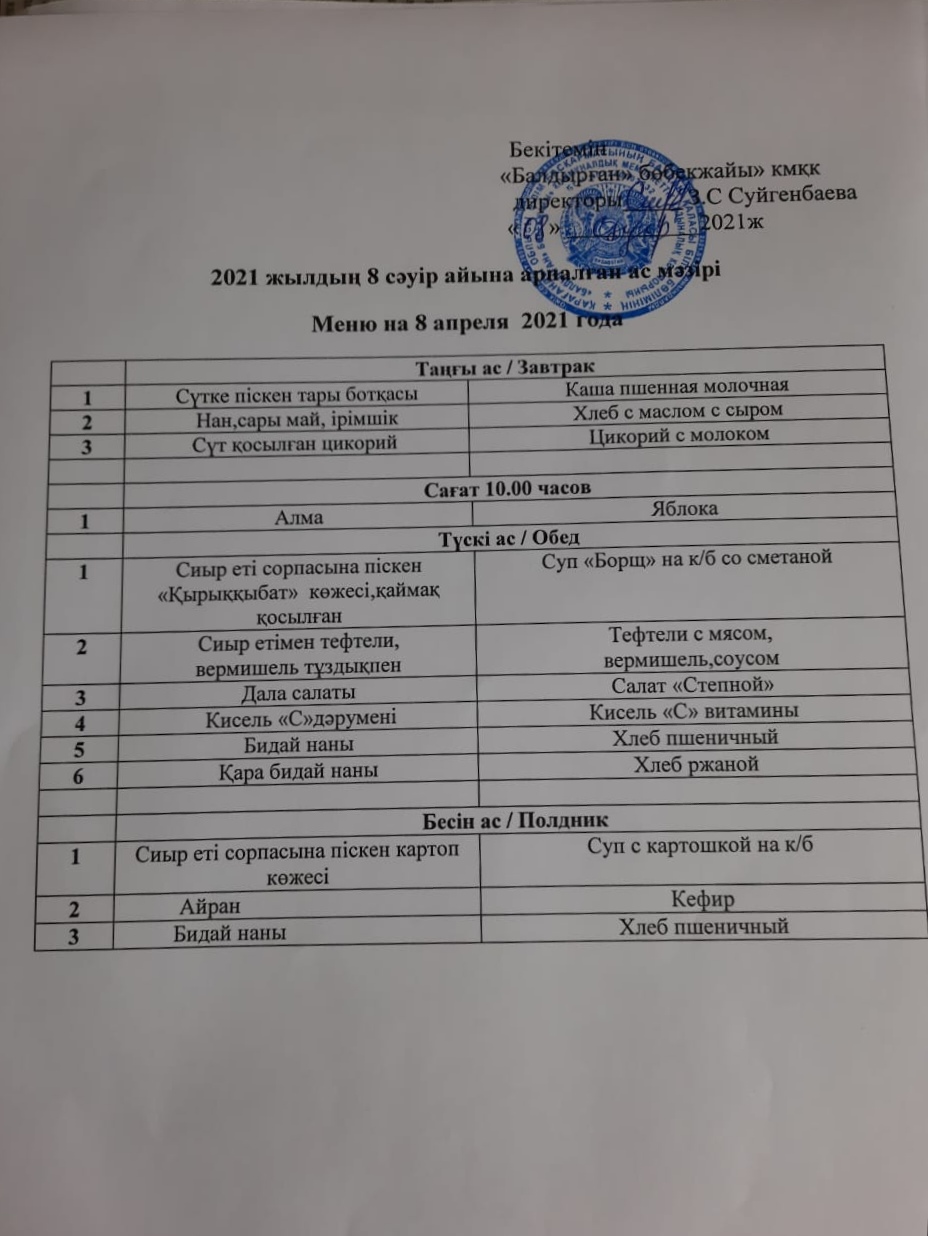 08.04.2021ж2021 жылдың 8 сәуiр айына арналған ас мәзірі |