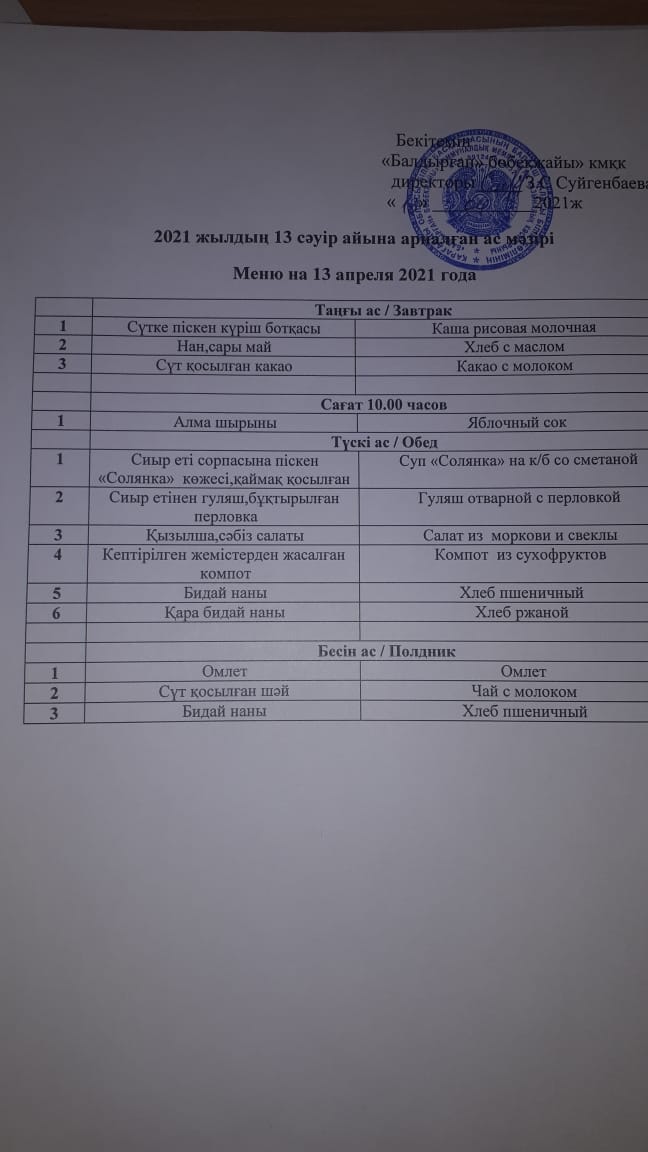 13.04.2021ж2021 жылдың 13 сәуiр айына арналған ас мәзірі |