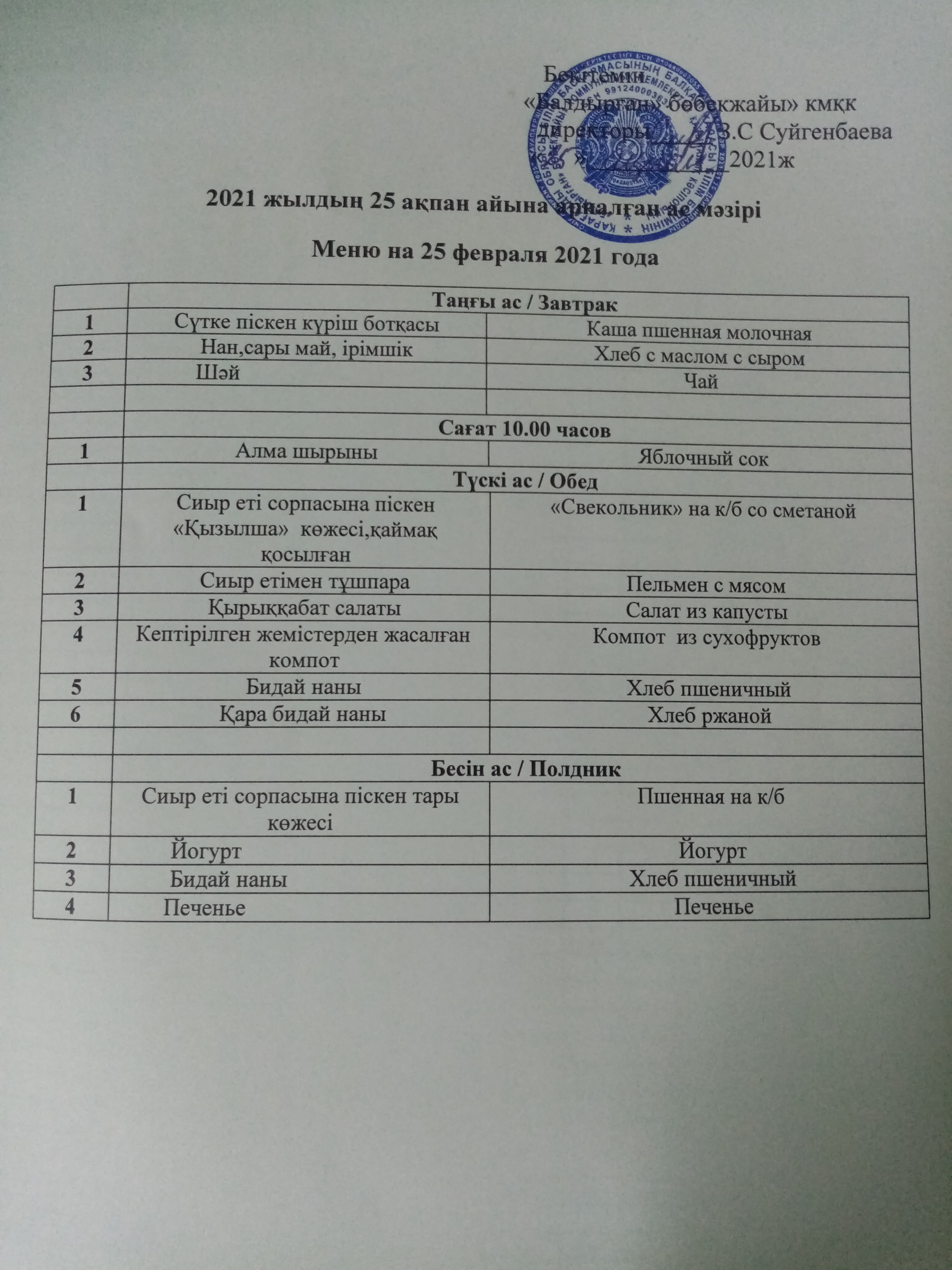 25.02.2021ж2021 жылдың 25 ақпан айына арналған ас мәзірі |
