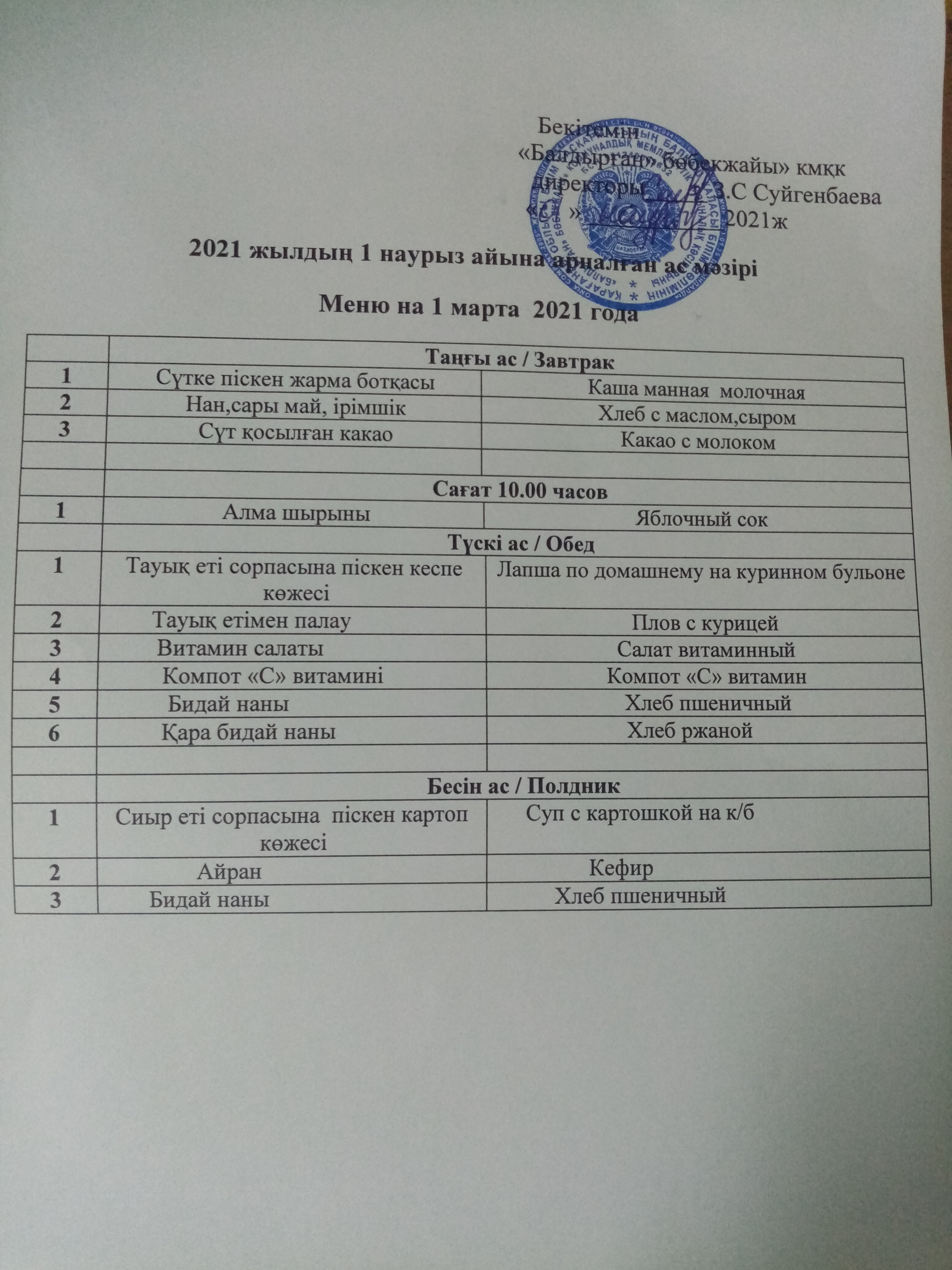 01.03.2021ж2021 жылдың 1 наурыз айына арналған ас мәзірі |