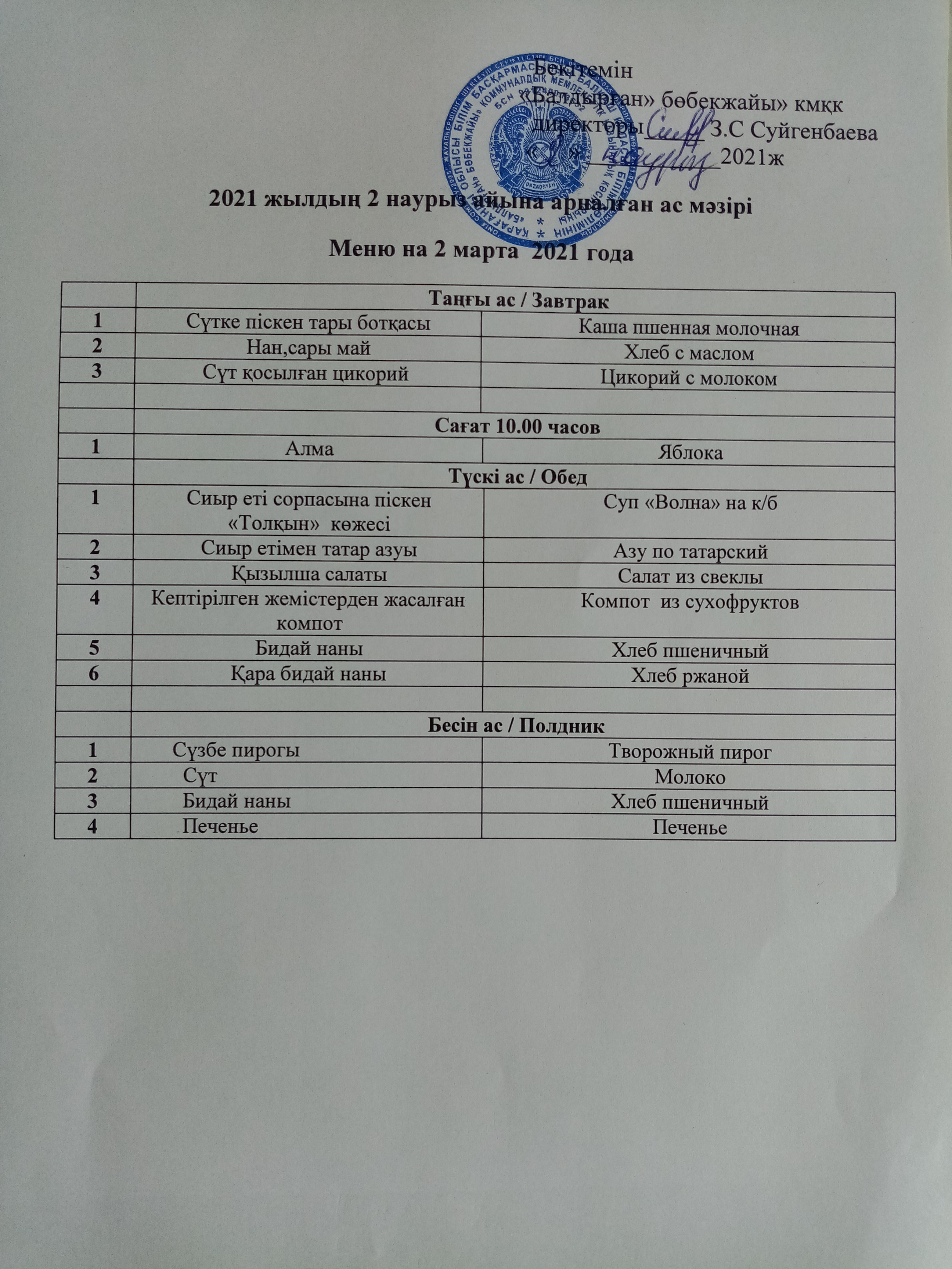 02.03.2021ж2021 жылдың 2 наурыз айына арналған ас мәзірі |