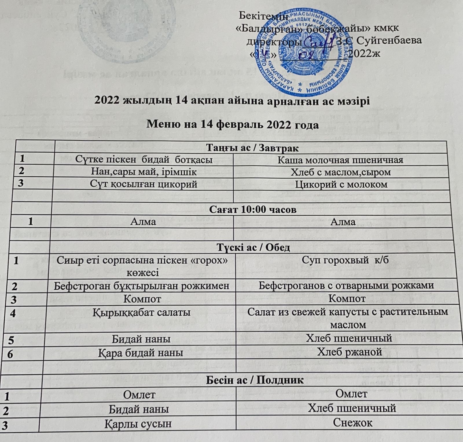 Меню на 11 февраль 2022года