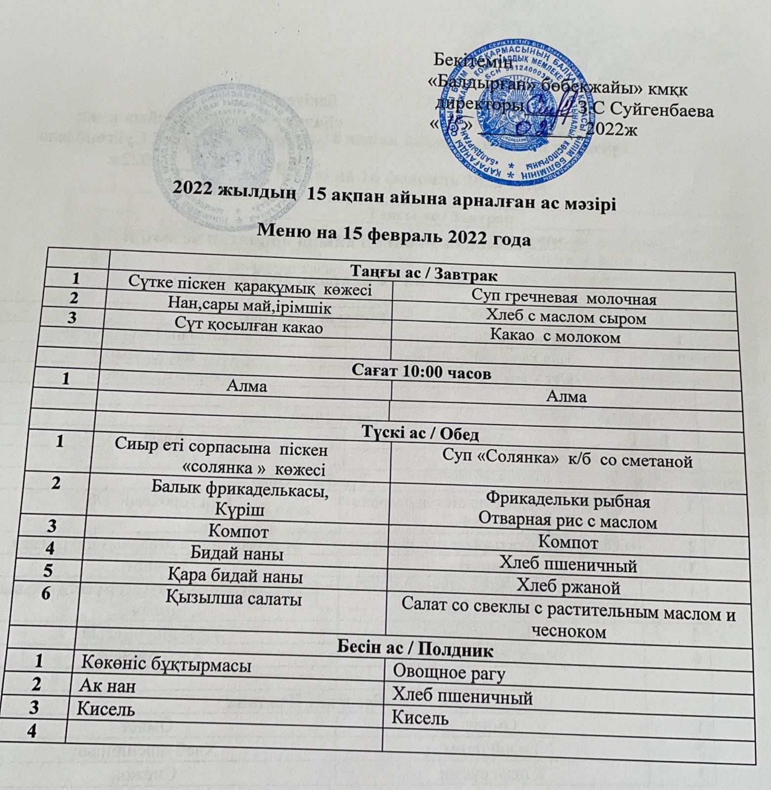 Меню на 15 февраль 2022 года