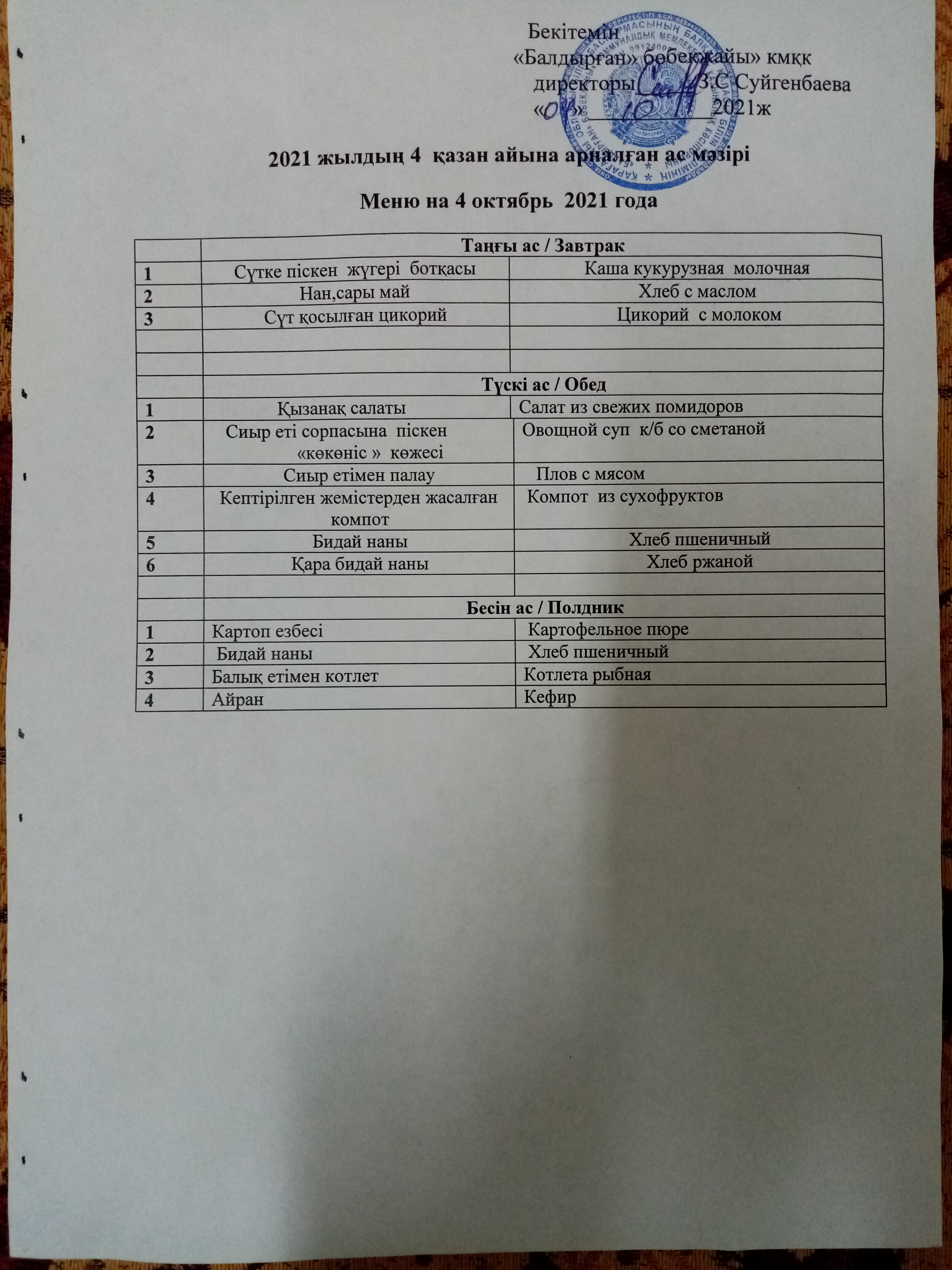 04.10.2021ж2021 жылдың 4 казан айына арналған ас |