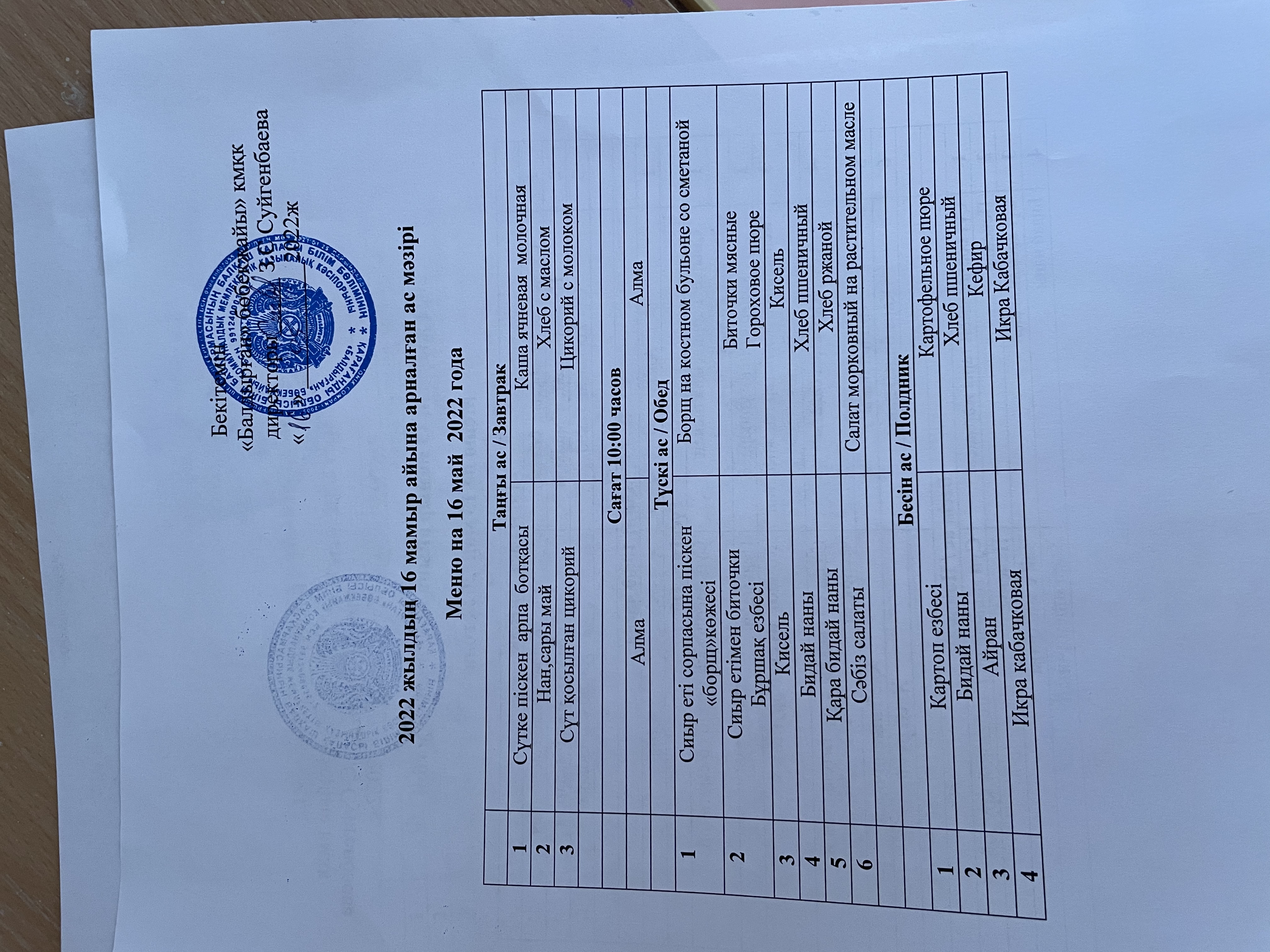 Меню на 16 мая 2022года