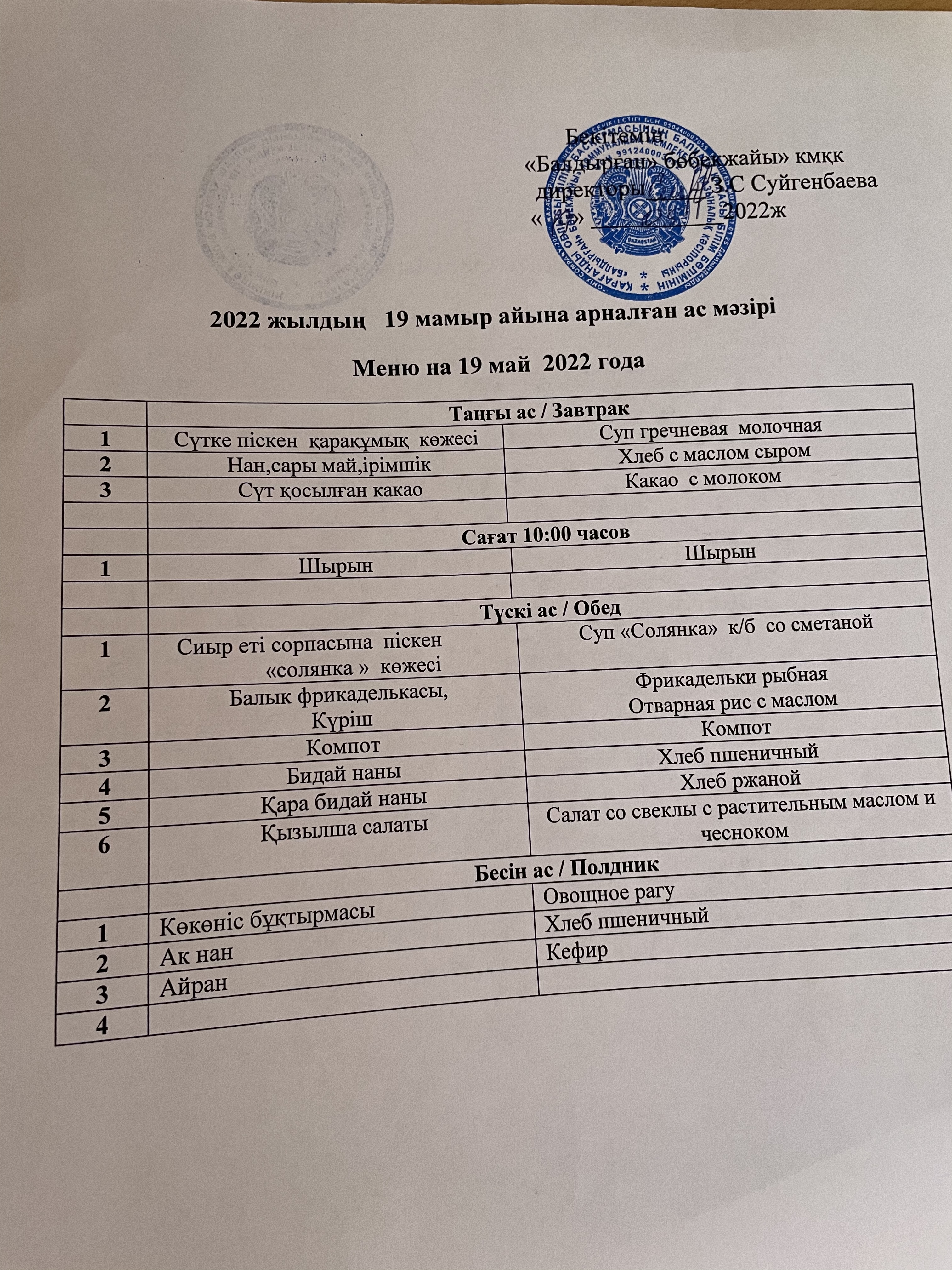 Меню на 19 мая 2022года