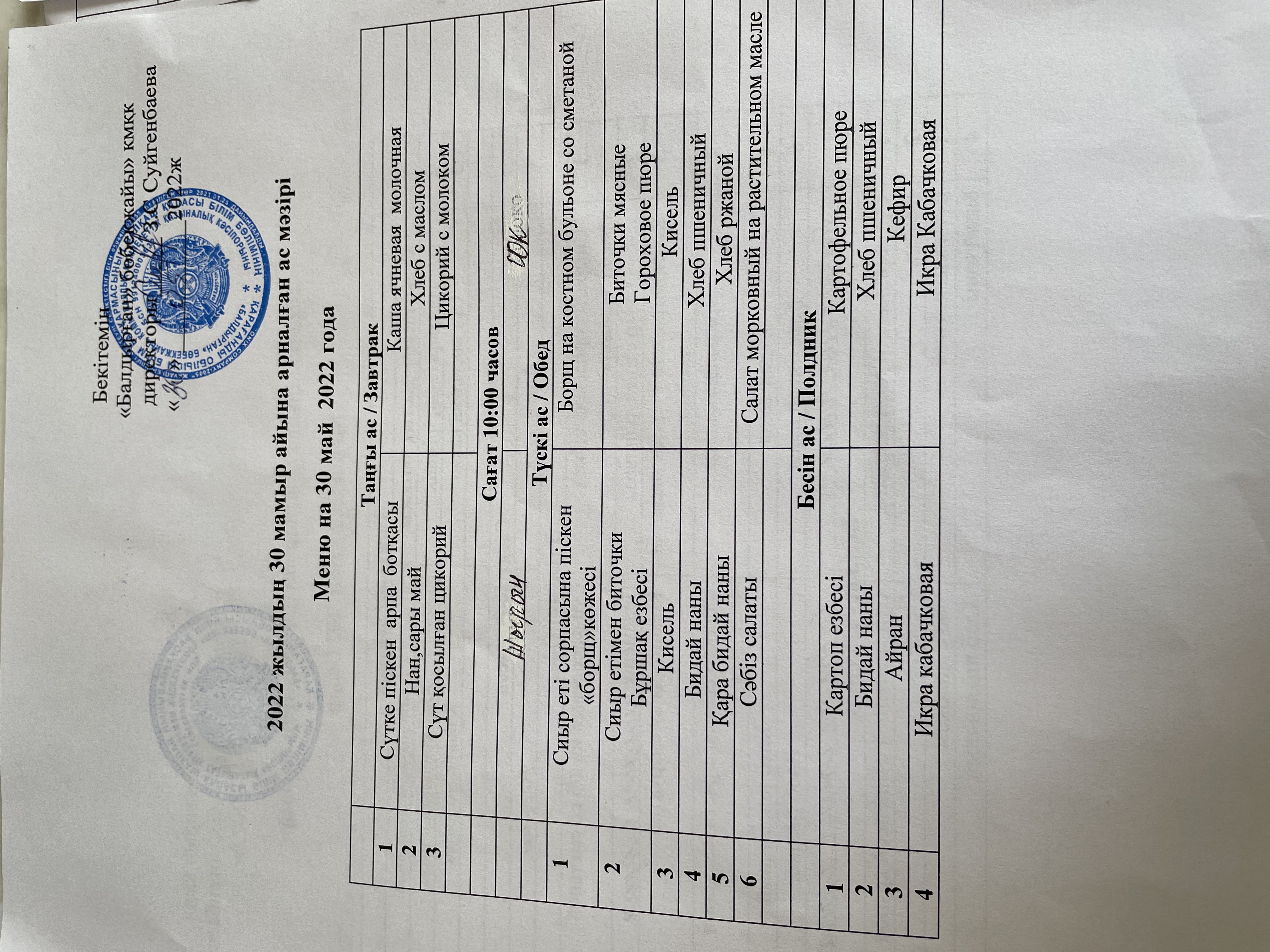 Меню на 30 мая 2022года
