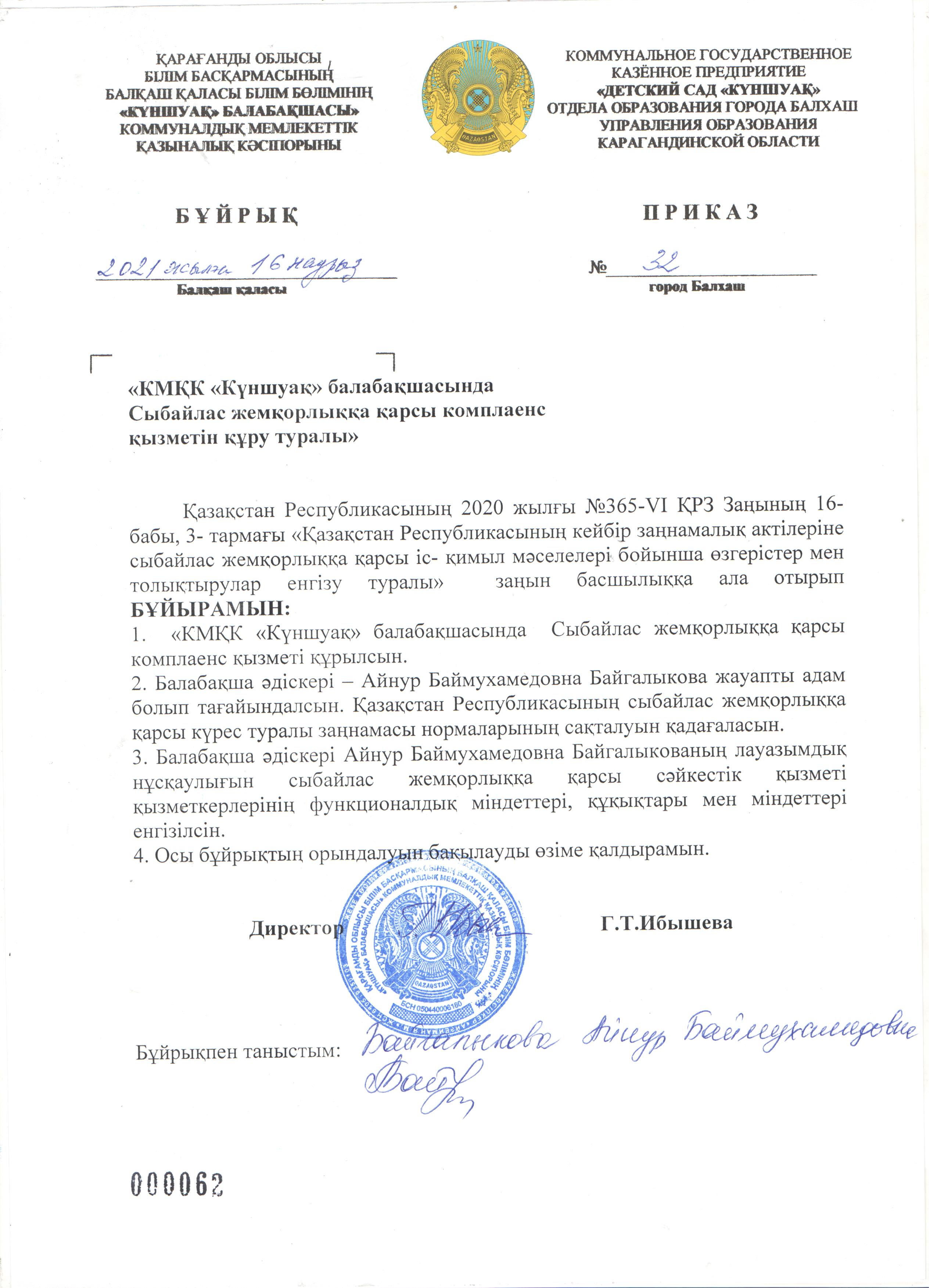 Приказ о назначении ответственного лица за Комплаенс службу
