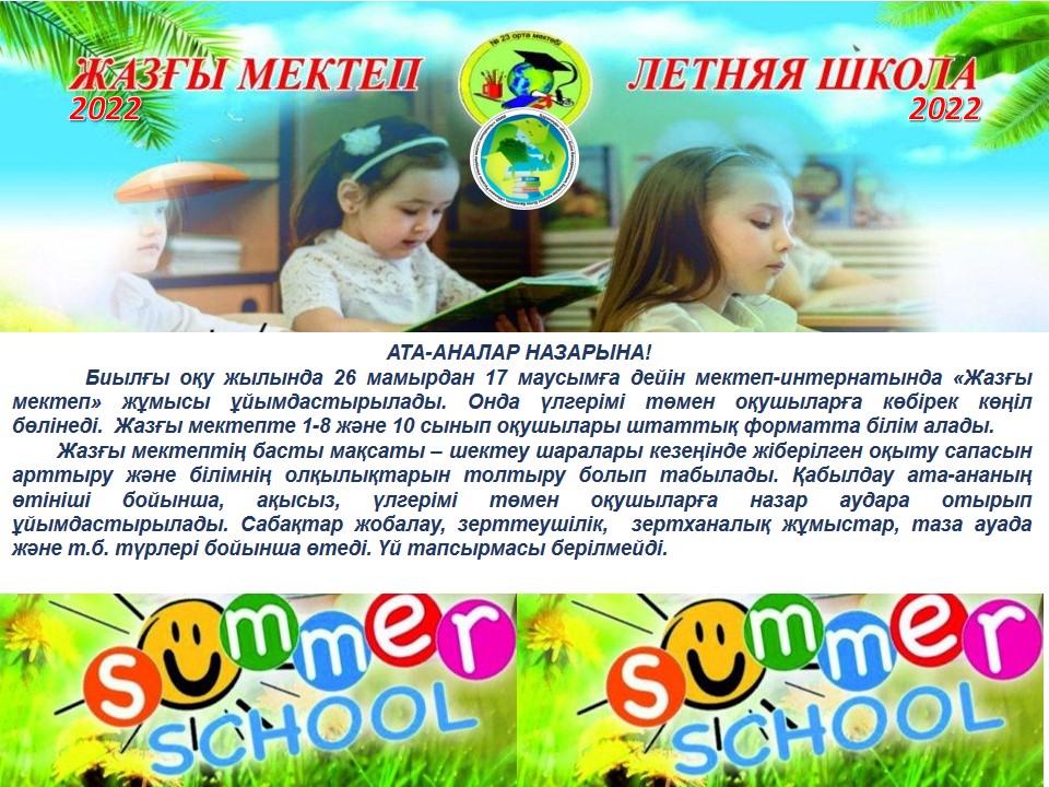 Вниманию родителей! Летняя школа - 2022#летняяшкола_2022 В этом учебном году с 26 мая по 17 июня в школе-интернате будет организована «Летняя школа», ориентированная на слабоуспевающих учащихся. В летней школе учащиеся 1-8 и 10 классов будут обучаться в штатном формате. Основной целью летней школы является повышение качества знаний и восполнение пробелов в обучении, которые были упущены в период действия ограничительных мер. Занятия на бесплатной основе по желанию родителей, с упором на слабоуспевающих учащихся. Занятия включают проектные работы, исследования, лабораторные работы, занятия на свежем воздухе и др. Домашнее задание не задается. |