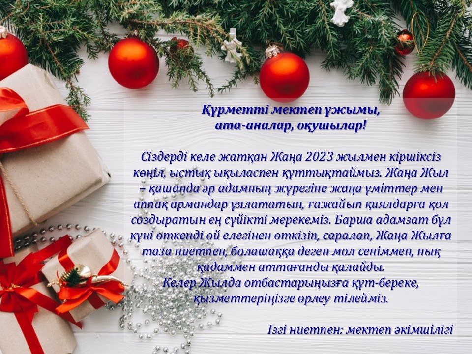 Уважаемый коллектив школы, родители, ученики! Мы искренне поздравляем вас с Новым 2023 годом. Новый год – наш любимый праздник, который всегда вселяет в сердце каждого новые надежды и светлые мечты, открывает доступ к чудесным фантазиям. В этот день все человечество хочет осмыслить прошлое и войти в Новый год с чистыми намерениями, полной верой в будущее и твердым шагом. Желаем удачи вашей семье и успехов в карьере в наступающем году. С уважением: Администрация школы.