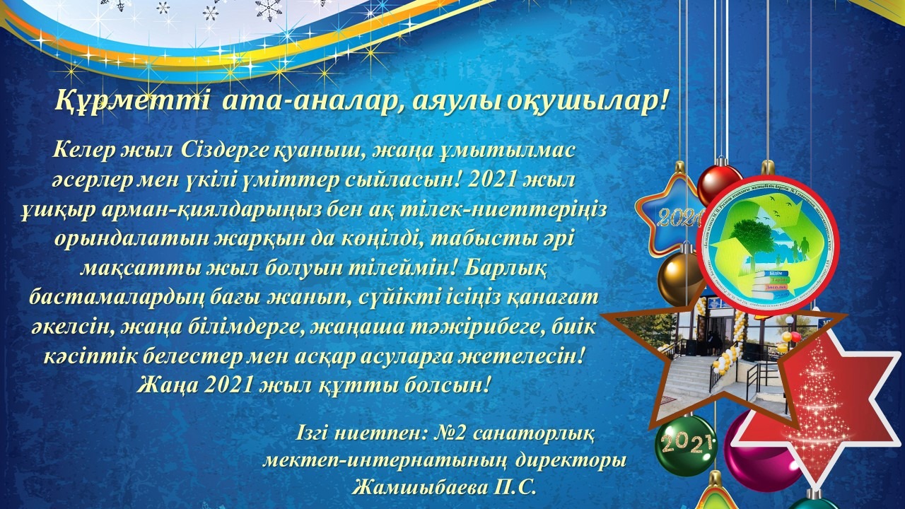 Уважаемые родители, дорогие ученики! Уходит в прошлое 2020 год, но с нами остаются тот опыт, те достижения и победы, которые он принес. Пусть в каждой семье будет маленький волшебный мир, где царит атмосфера уюта и тепла, взаимной любви, надежды. В наших силах сделать жизнь яркой и красочной, полной счастья, мира, и добра. Я желаю, чтобы 2021 год принёс спокойствие и удачу в каждую семью и, чтобы наша общая школьная семья добивалась новых высоких результатов, сохраняла атмосферу доверия, доброжелательности и уважения в отношениях друг с другом. С наступающим 2021 годом! С наилучшими пожеланиями директор школы-интерната № 2 П. С. Жамшыбаева