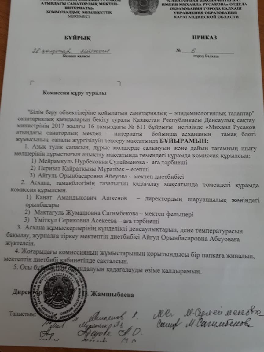 Об организации питания в столовой и распределении обязанностейПриказ № 5 от 28 января 2021 г. по КГУ "САНАТОРНАЯ ШКОЛА-ИНТЕРНАТ ИМЕНИ МИХАИЛА РУСАКОВА" ОТДЕЛА ОБРАЗОВАНИЯ ГОРОДА БАЛХАШ УПРАВЛЕНИЯ ОБРАЗОВАНИЯ КАРАГАНДИНСКОЙ ОБЛАСТИ |