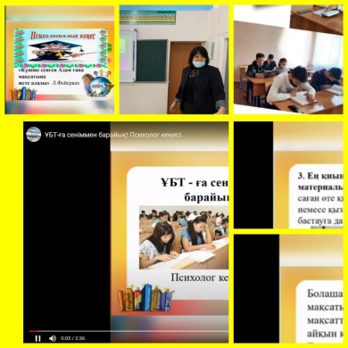 11 сынып оқушыларымен «ҰБТ-ға сеніммен барайық!» атты тренинг жүргізілді.11 қараша күні 11 сынып оқушыларымен «ҰБТ-ға сеніммен барайық!» атты тренинг жүргізілді. Тренингке барлық оқушы қатысты. Мақсаты оқушыларды психологиялық тұрғыдан дайындау, аффирмация туралы түсінік қалыптастыру. Оқушылардың өзін тану арқылы, өзіндік бағалауын қалыптастыру, стрессті жеңуге жол көрсету. |