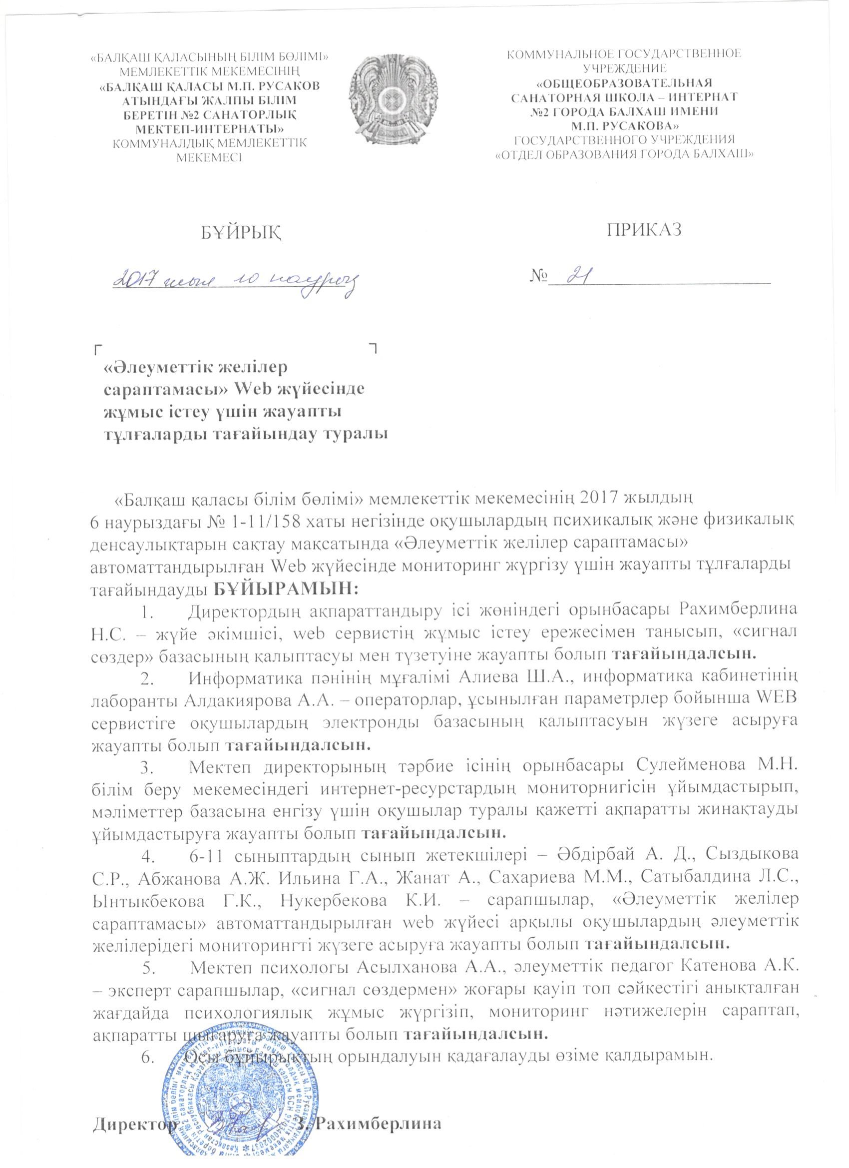 Приказ № 21 директора КГУ "ОСШИ №2" от 10 марта 2017 года, основание - письмо № 1-11/158 ГУ "Городской отдел образования" от 6 марта 2017 года