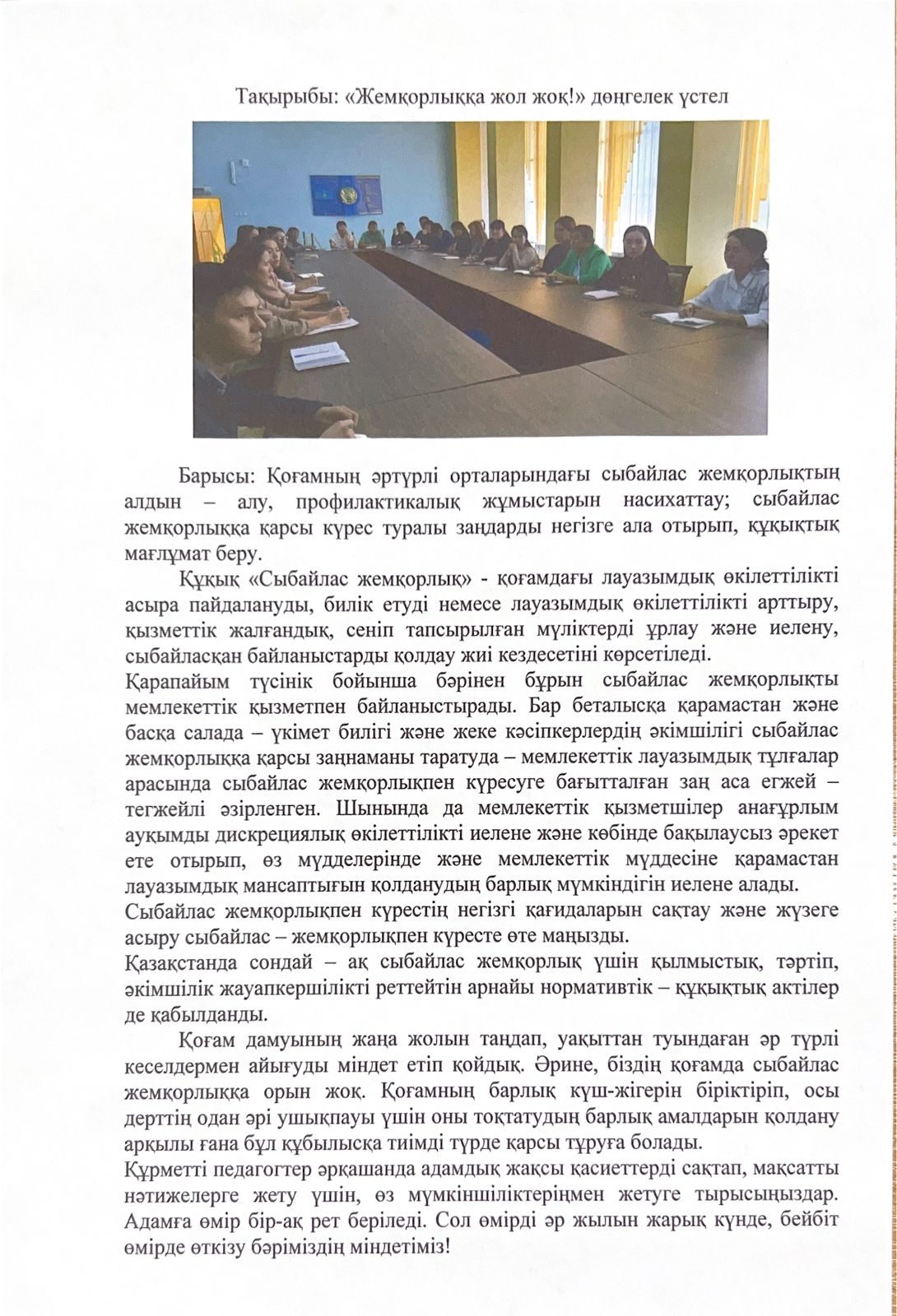 "Жемқорлыққа жол жоқ"Қоғамның әртүрлі орталарындағы сыбайлас жемқорлықтың алдын – алу, профилактикалық жұмыстарын насихаттау; сыбайлас жемқорлыққа қарсы күрес туралы заңдарды негізге ала отырып, құқықтық мағлұмат беру. |