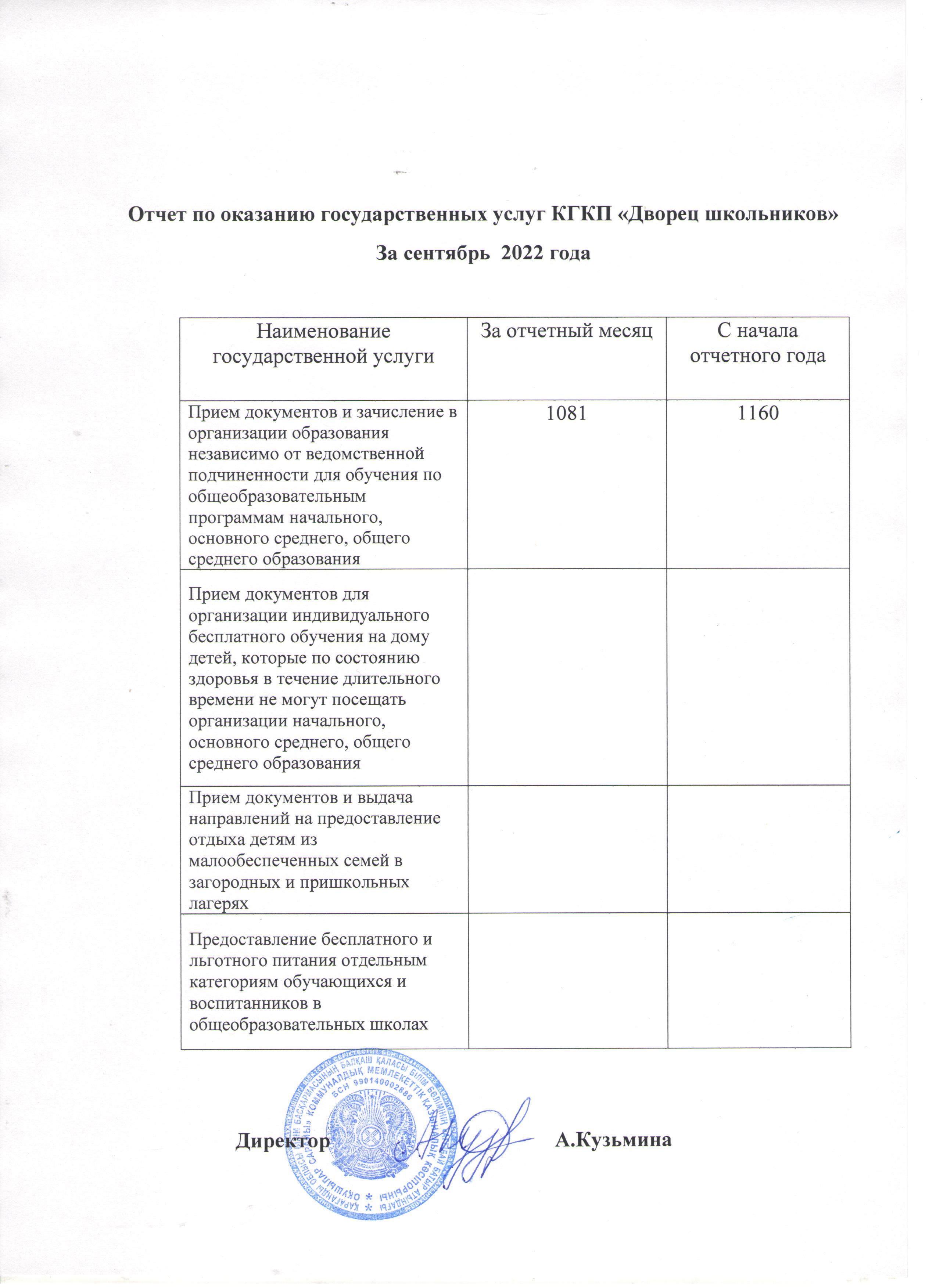 Отчет по оказанию государственных услуг КГКП "Дворец школьников им. Агыбай батыра" сентябрь 2022г.Отчет по оказанию государственных услуг КГКП "Дворец школьников им. Агыбай батыра" сентябрь 2022г. |