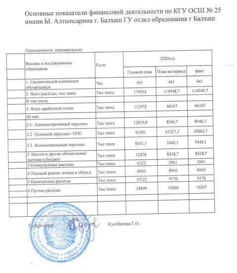Основные показатели финансовой деятельности по КГУ ОСШ№25 имени Ы.Алтынсарина за 2020 годОсновные показатели финансовой деятельности по КГУ ОСШ№25 имени Ы.Алтынсарина за 2020 год |