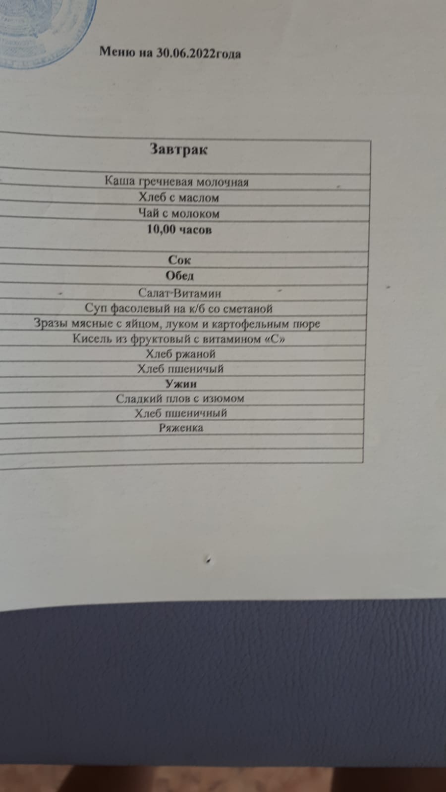 меню 30.06.2022