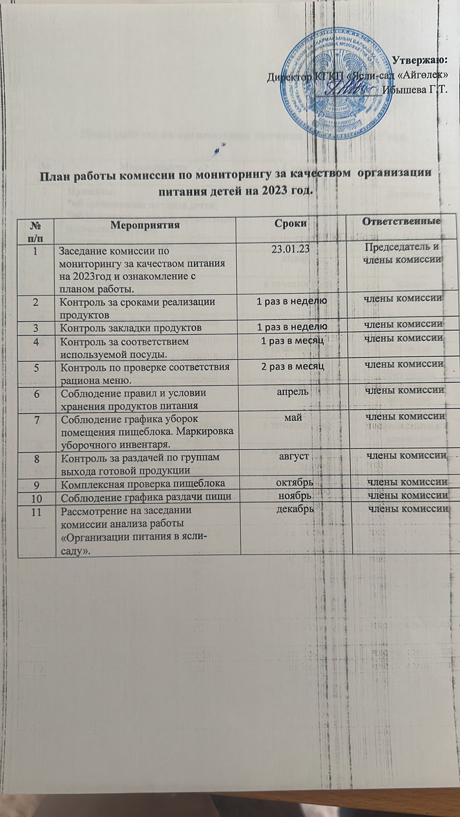 План бракеражной комиссии на 2023 годПлан работы бракеражной комиссии № Название мероприятий Ответственные Сроки 1 Анализ санитарных книжек у сотрудников пищеблока. Утверждение плана работы комиссии на новый учебный год. члены бракеражной комиссии Сентябрь 2 Отслеживание соответствия с нормами и калорийностью блюд. Заполнение виртуального склада и списания продуктов по порталу indigo24kz. члены бракеражной комиссии ежедневно 5 Контроль санитарно-гигиенического состояния пищеблока. члены бракеражной комиссии постоянно 6 Комплексная проверка состояния пищеблока, наличие суточных проб, маркировка банок и кухонного инвентаря. члены бракеражной комиссии 1 раз в месяц 7 Контроль взвешивания порций, правила хранения продуктов, температурный режим, дата реализации продуктов. члены бракеражной комиссии ежемесячно 8 Наличие контрольного блюда. Соблюдение технологии закладки продуктов. члены бракеражной комиссии ежемесячно 9 Правила хранения овощей и фруктов, сыпучих продуктов. Соблюдение графика уборок помещений пищеблока. члены бракеражной комиссии декабрь 10 Обработка используемой посуды и кухонного инвентаря. члены бракеражной комиссии 1 раз в месяц 11 Проверка соответствия порции по возрасту ребенка по весу с контрольной порцией. члены бракеражной комиссии январь 12 Обработка яиц перед приготовлением. члены бракеражной комиссии февраль 13 Соблюдение технологии приготовления блюд. члены бракеражной комиссии март 14 Правила хранения продуктов. Маркировка уборочного инвентаря. члены бракеражной комиссии апрель 15 Заседание членов бракеражной комиссии по теме: « Анализ работы комиссии за 2023-2024 уч.года». члены бракеражной комиссии май |