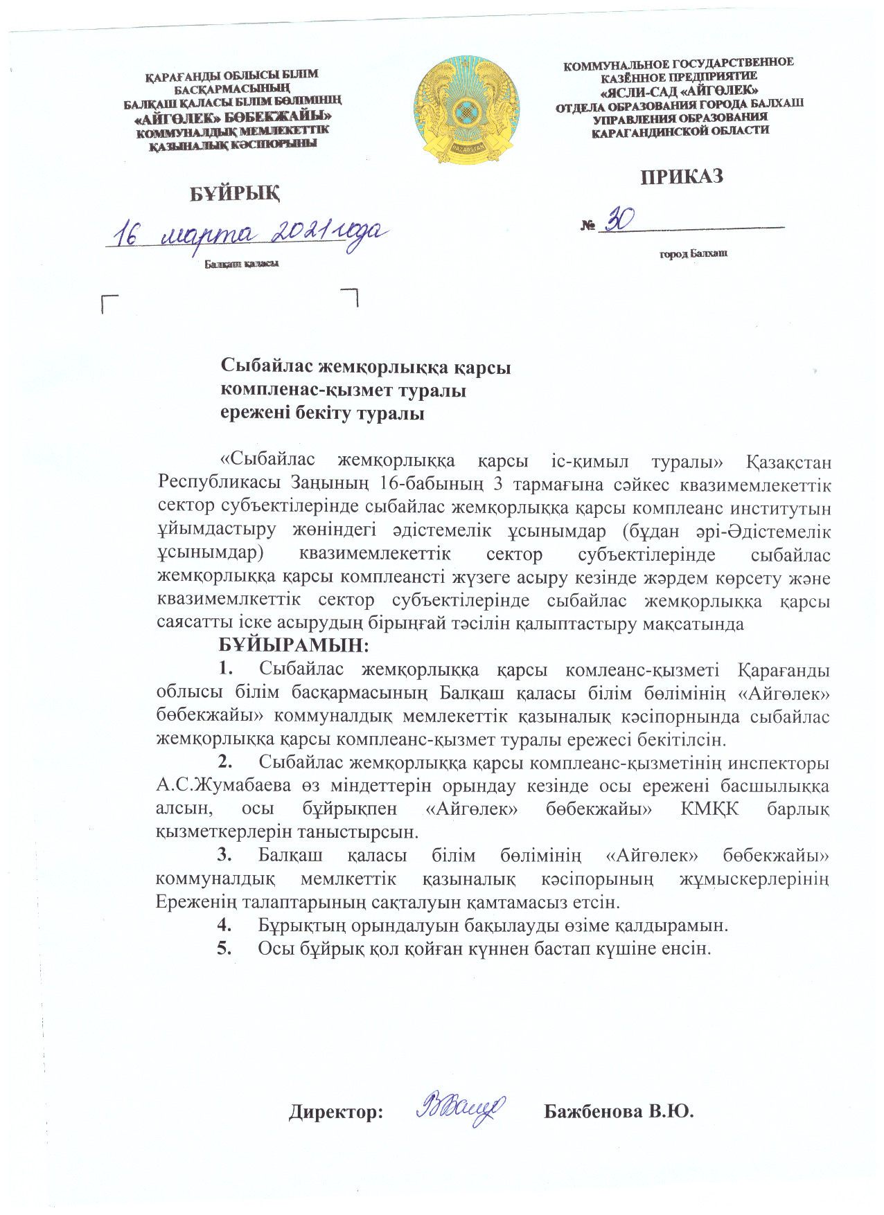 Қазақстан Республикасының 2015-2025 жылдарға арналған сыбайлас жемқорлыққа қарсы стратегиясын іске асыру және көлеңкелі экономикаға қарсы іс-қимыл бойынша 2021-2023 жылдарға арналған "Айгөлек" бөбекжайы" КМҚК іс-шаралар жоспарыҚазақстан Республикасының 2015-2025 жылдарға арналған сыбайлас жемқорлыққа қарсы стратегиясын іске асыру және көлеңкелі экономикаға қарсы іс-қимыл бойынша 2021-2023 жылдарға арналған "Айгөлек" бөбекжайы" КМҚК іс-шаралар жоспары |