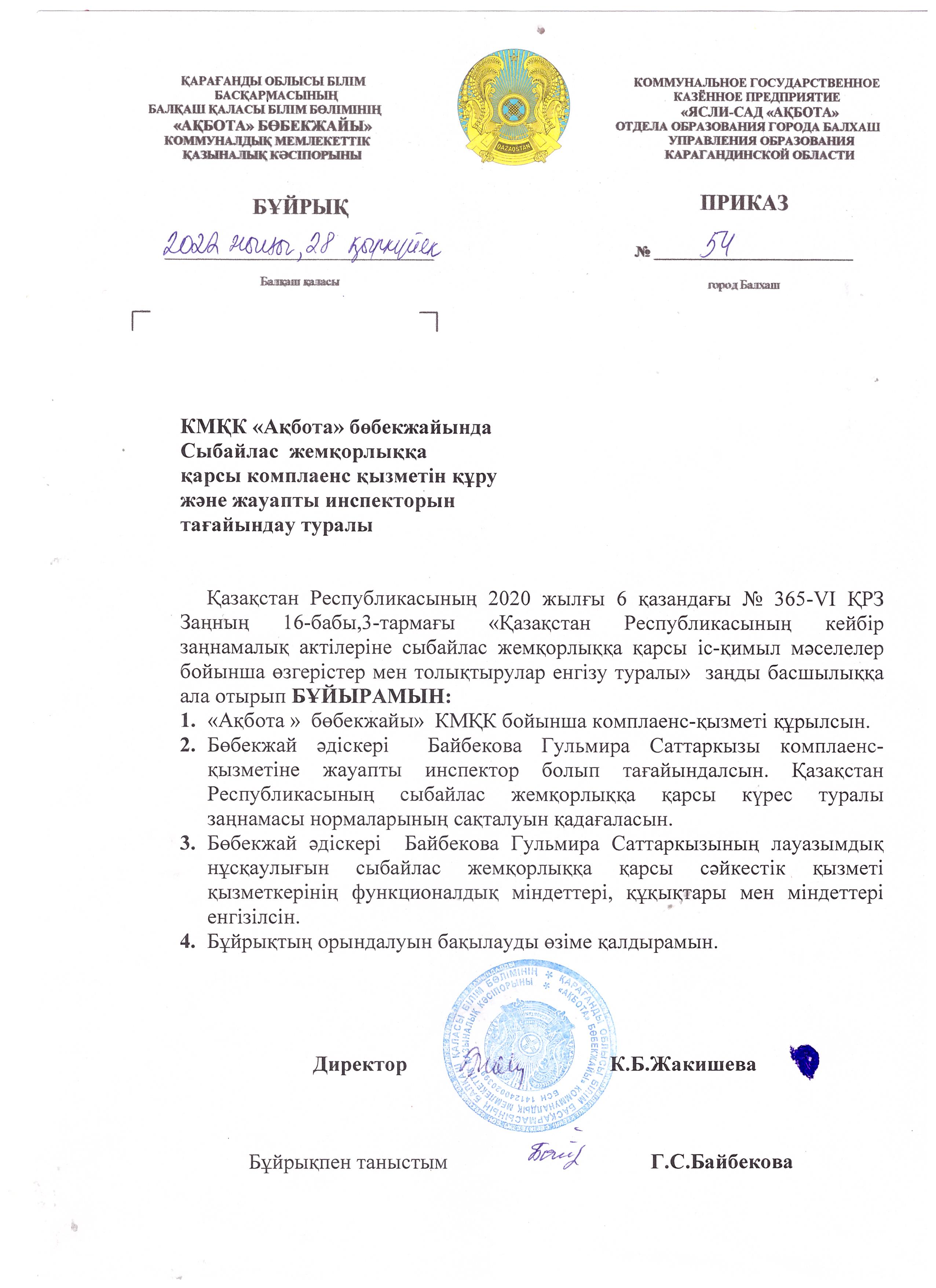 Қарағанды облысы Білім басқармасының сыбайлас жемқорлықтың алдын алу туралы 20 тамыз 2020 жылғы №260 бұйрығыҚарағанды облысы Білім басқармасының сыбайлас жемқорлықтың алдын алу туралы 20 тамыз 2020 жылғы №260 бұйрығы |